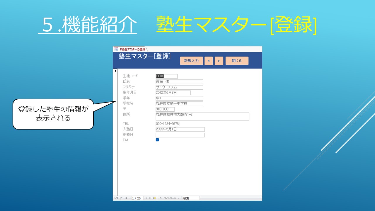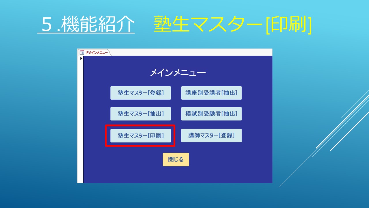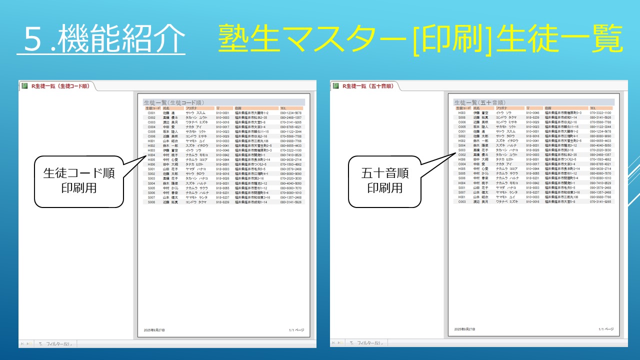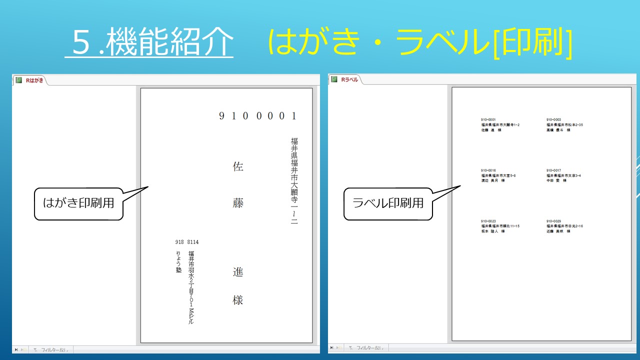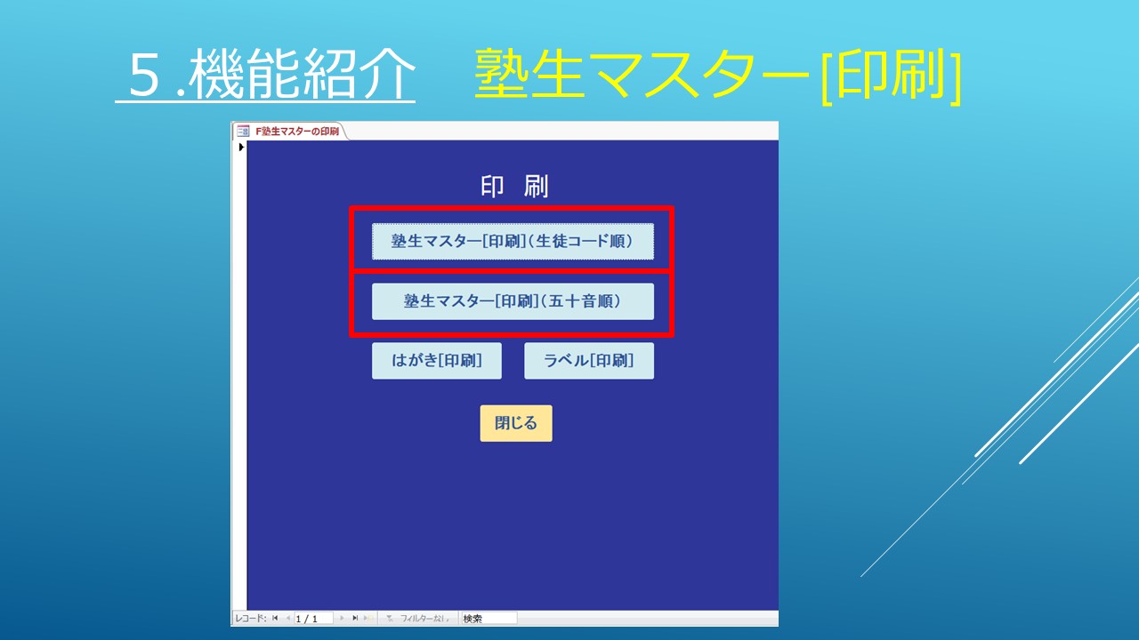 さらに、塾生や講師の登録、塾生一覧を、生徒コード順や五十音順で印刷できるほか、はがき用・ラベル用の印刷にも対応している。