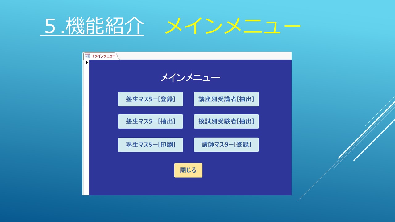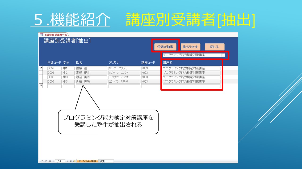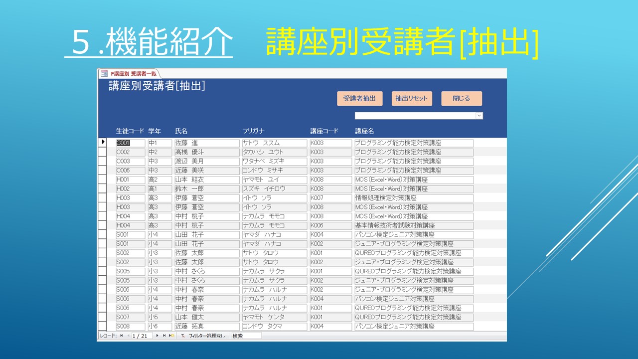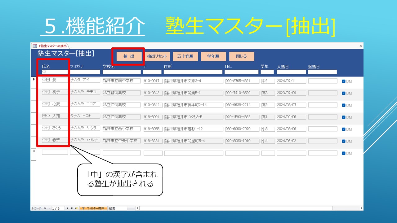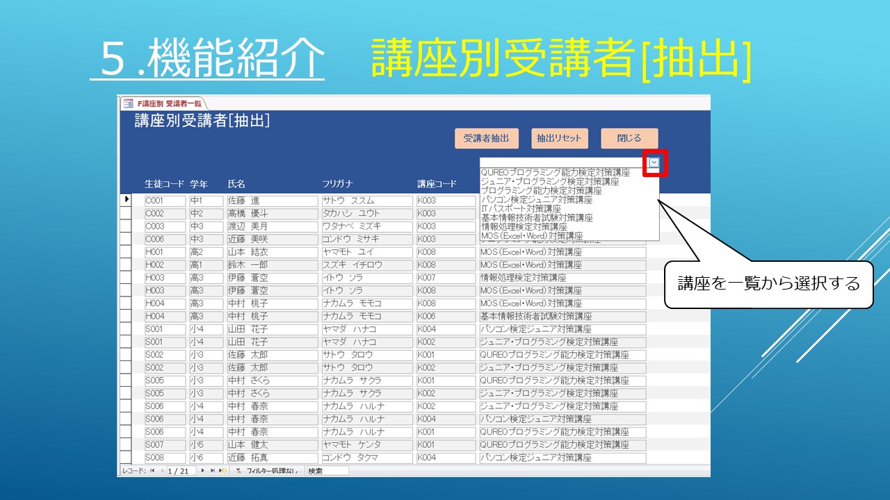 さらに、塾生や講師の登録、塾生一覧を、生徒コード順や五十音順で印刷できるほか、はがき用・ラベル用の印刷にも対応している。