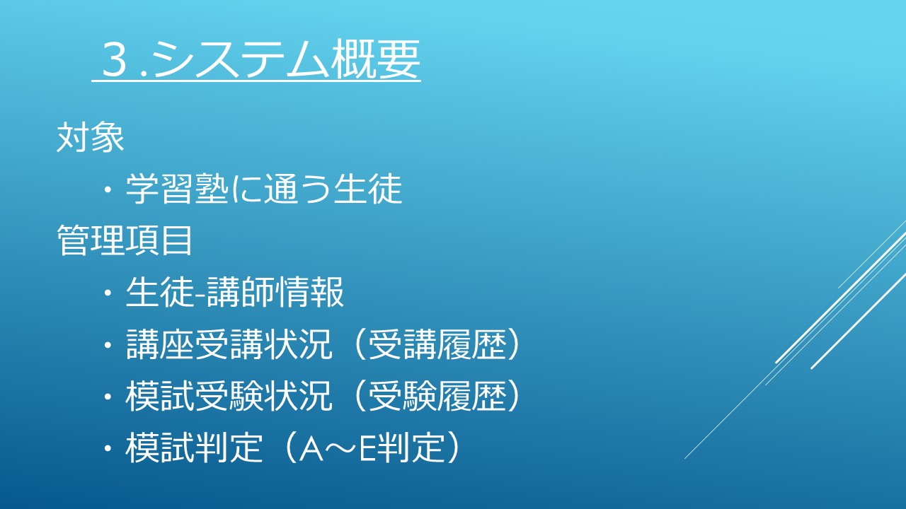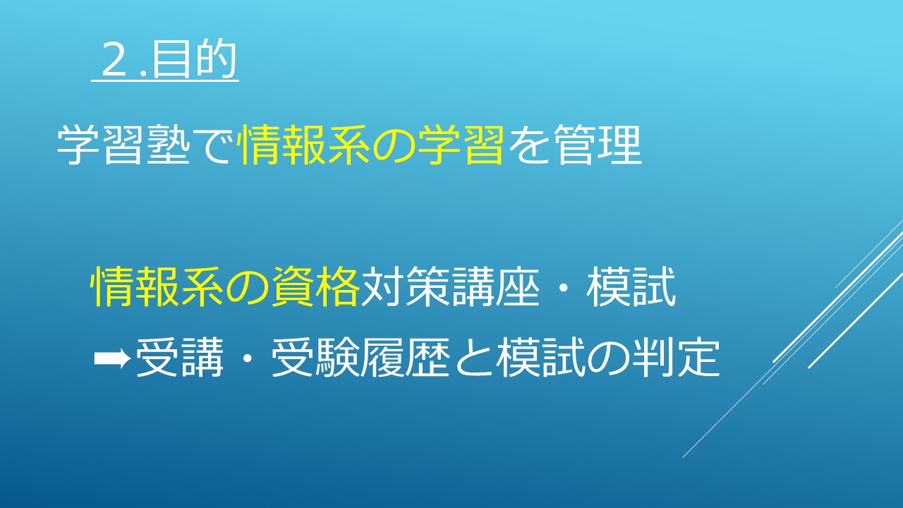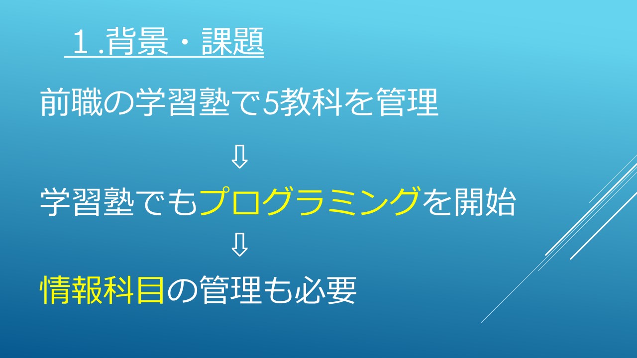 近年、小中高においてプログラミングや情報科目が必修化され、ITスキルへの対策が必要とされており、学習塾においても従来の5教科に加えて情報科目の習熟度を管理する必要性が出てきた。