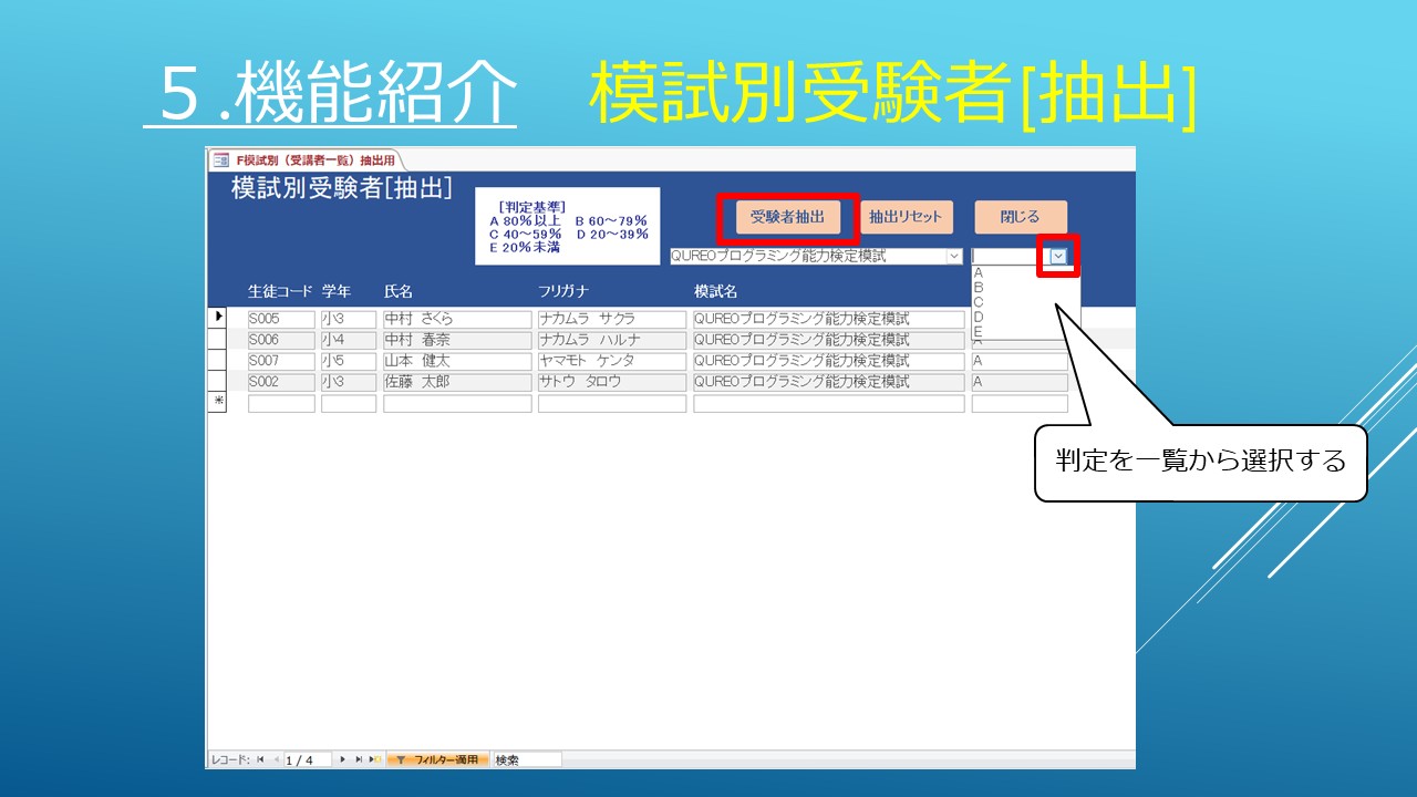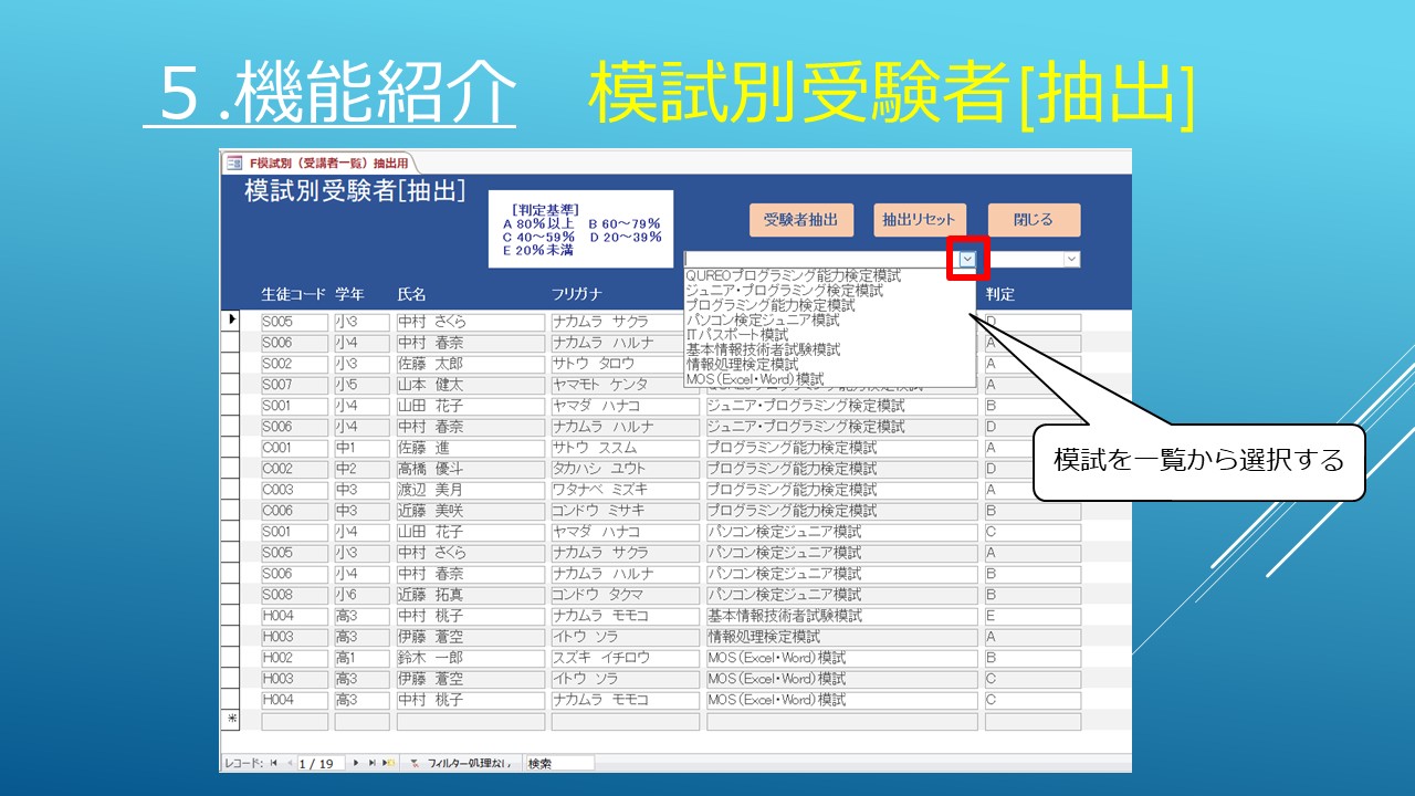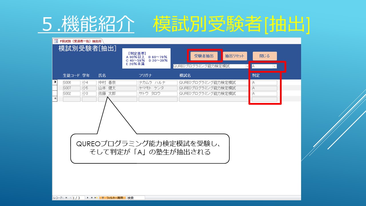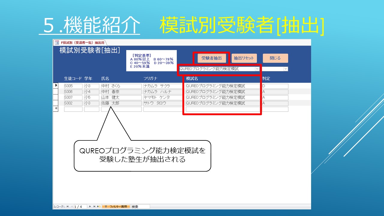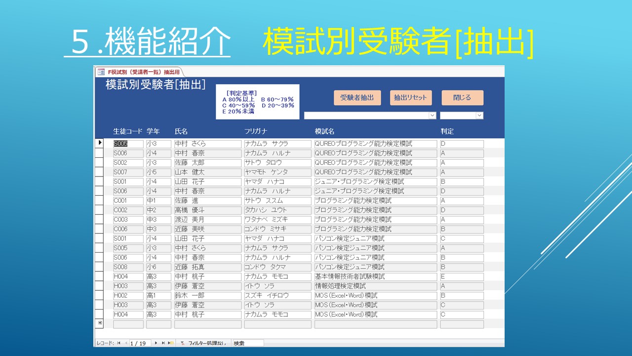 生徒ごとの講座受講履歴や模試受験履歴を抽出でき、模擬試験の判定結果も出力できる。