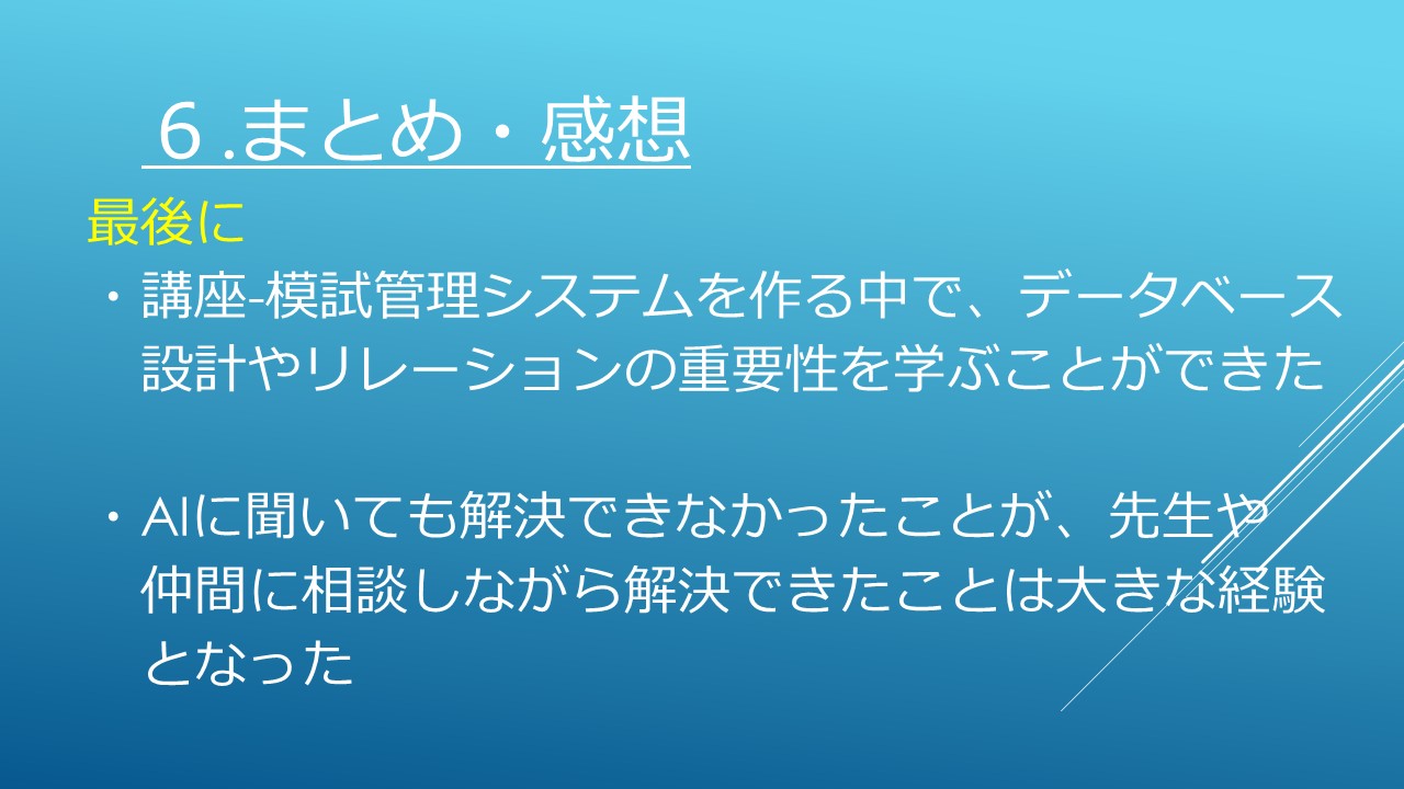授業中に学習した内容とほぼ同じ形式になってしまいましたが、本来の目的は、学習履歴や成績をもとに面談で活用できるフォーマットまで仕上げることでした。nそこで今後は、VBAのカレンダーやGASの面談設定を組み合わせて、完成を目指していきます。