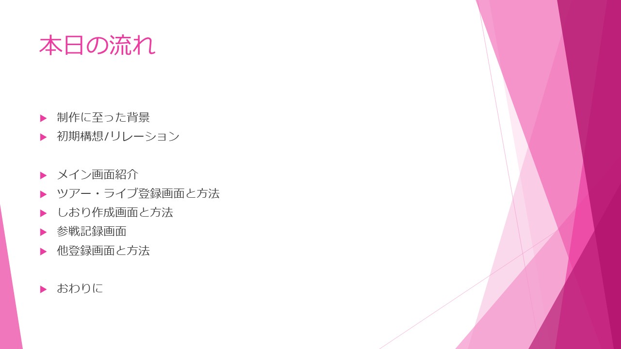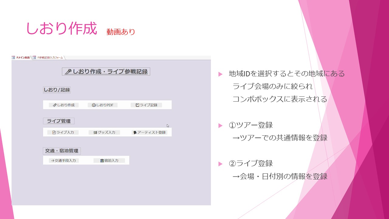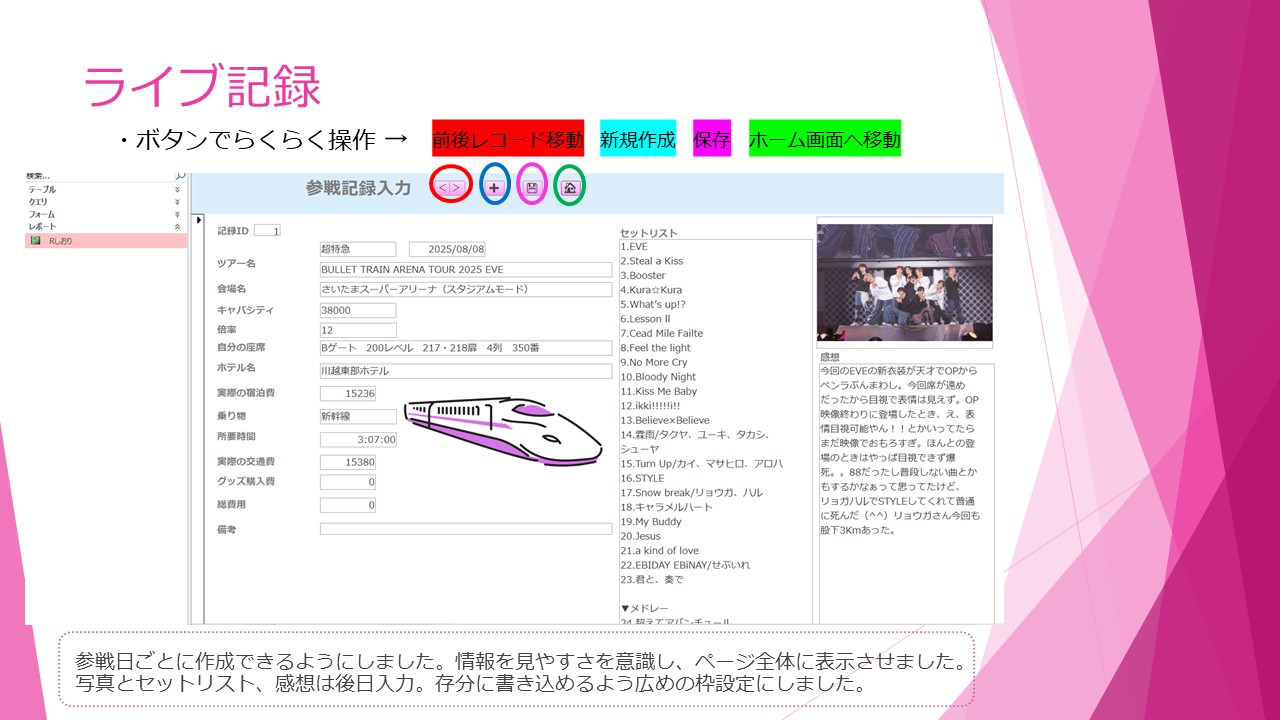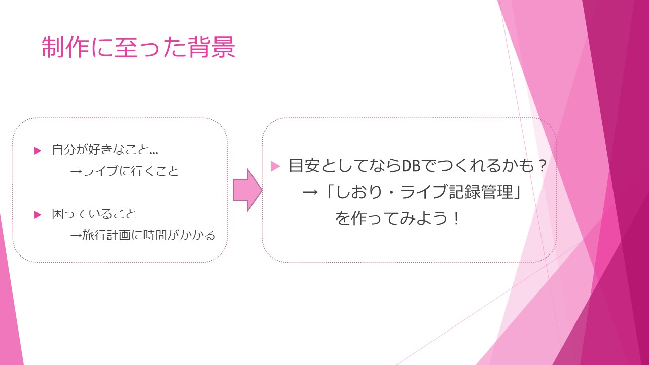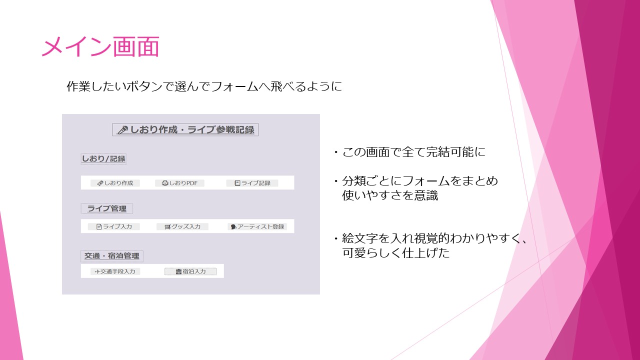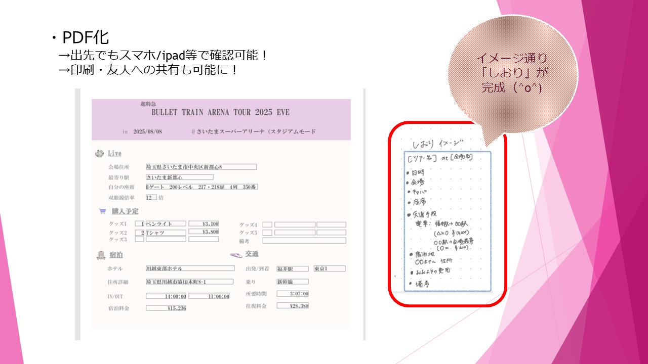 ライブに行くことが決まった際に、会場までの交通手段や経路・費用、宿泊地の決定が手間だと感じていた。おおよその費用であればデータ化しておくことができ、手軽になると考え作成。