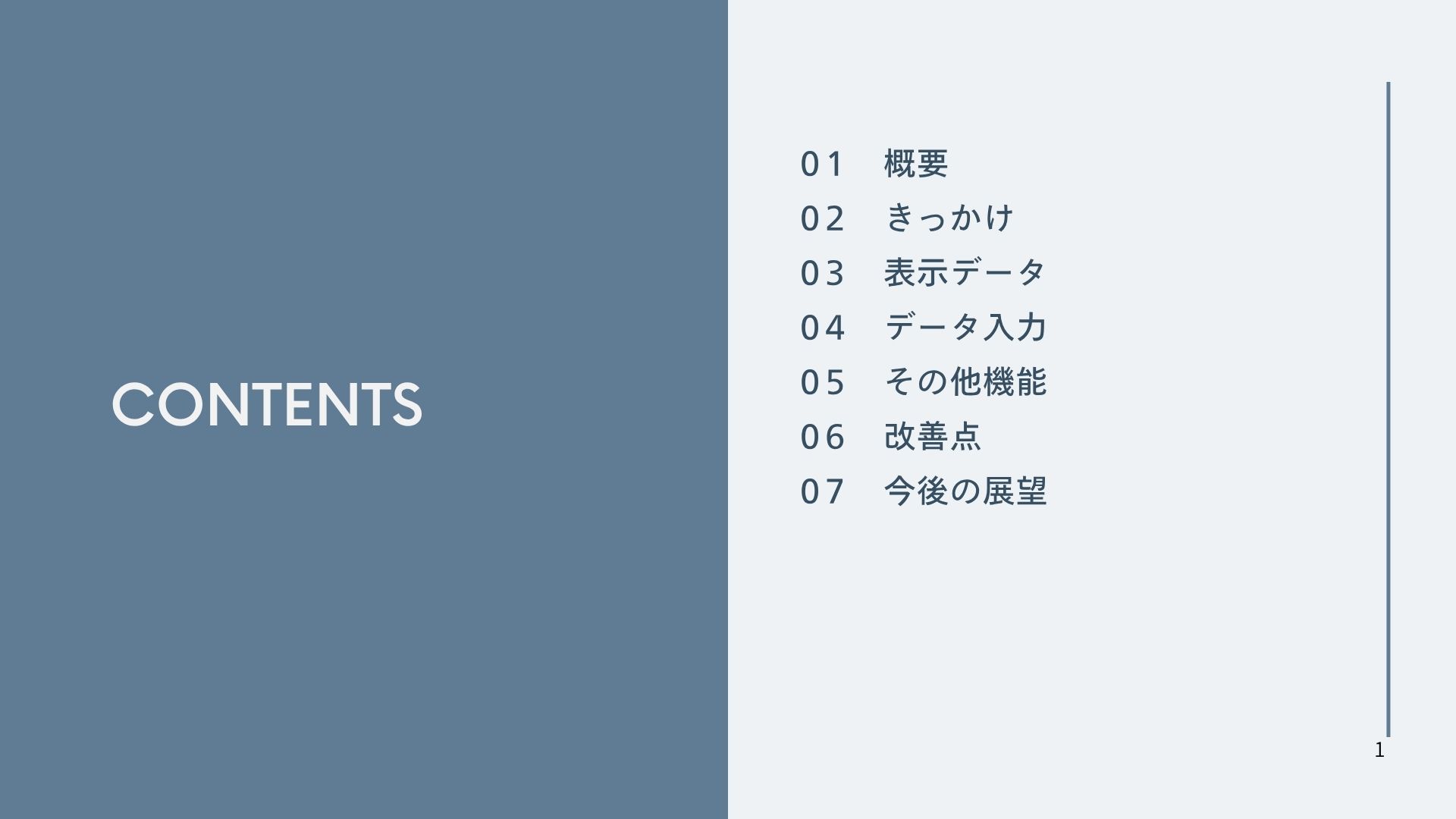 概要 制作したきっかけ 表示データ データ入力 その他機能 改善点 今後の展望