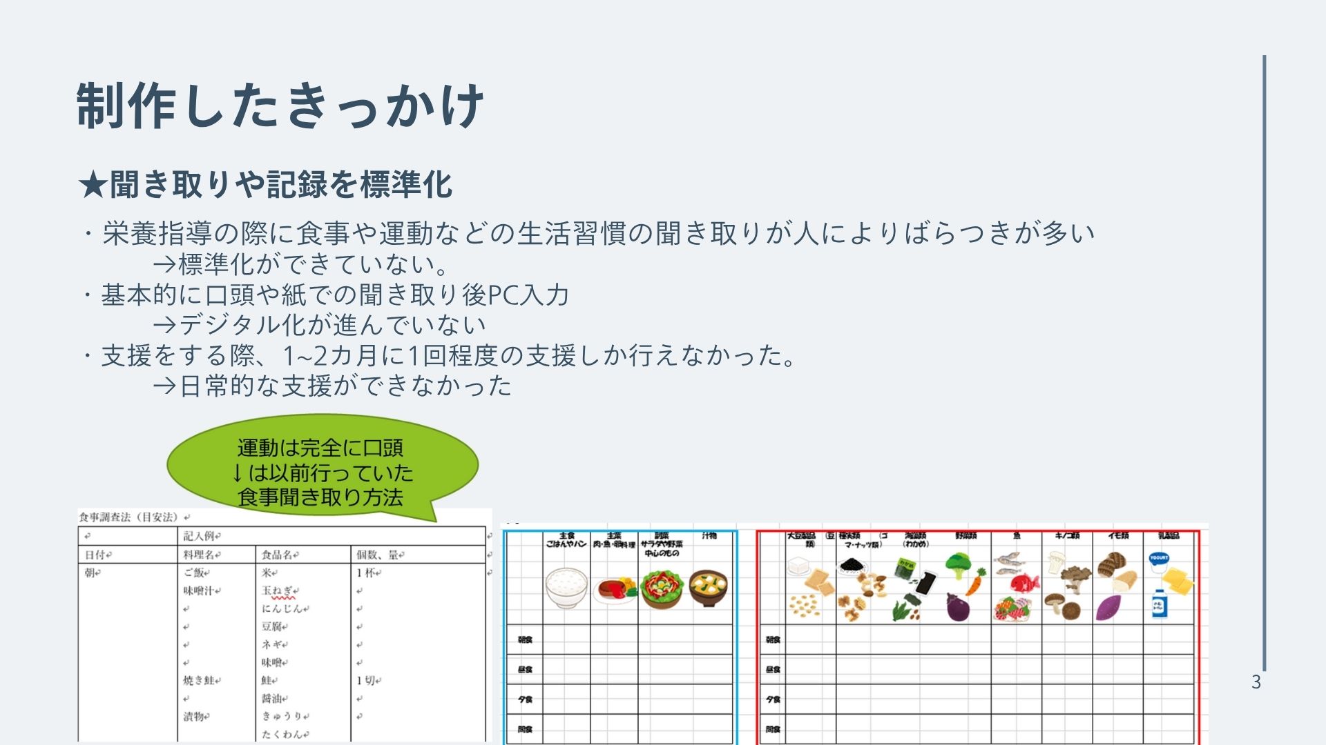 管理栄養士時代の栄養指導の際に食事や運動などの生活習慣の聞き取りが人によりばらつきが多く、標準化ができなかった。