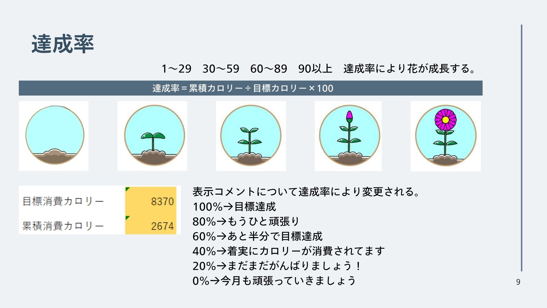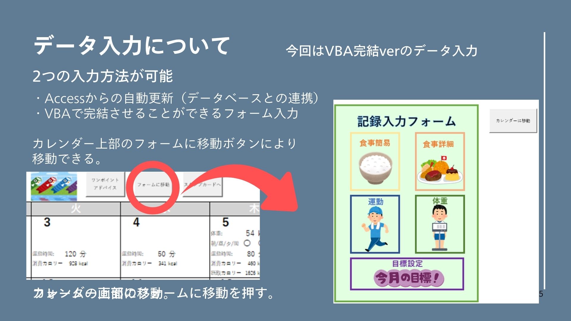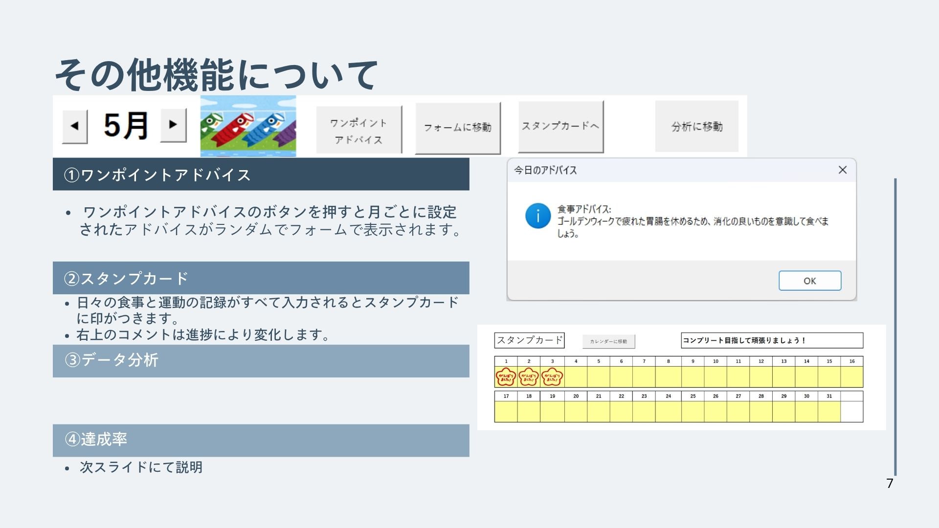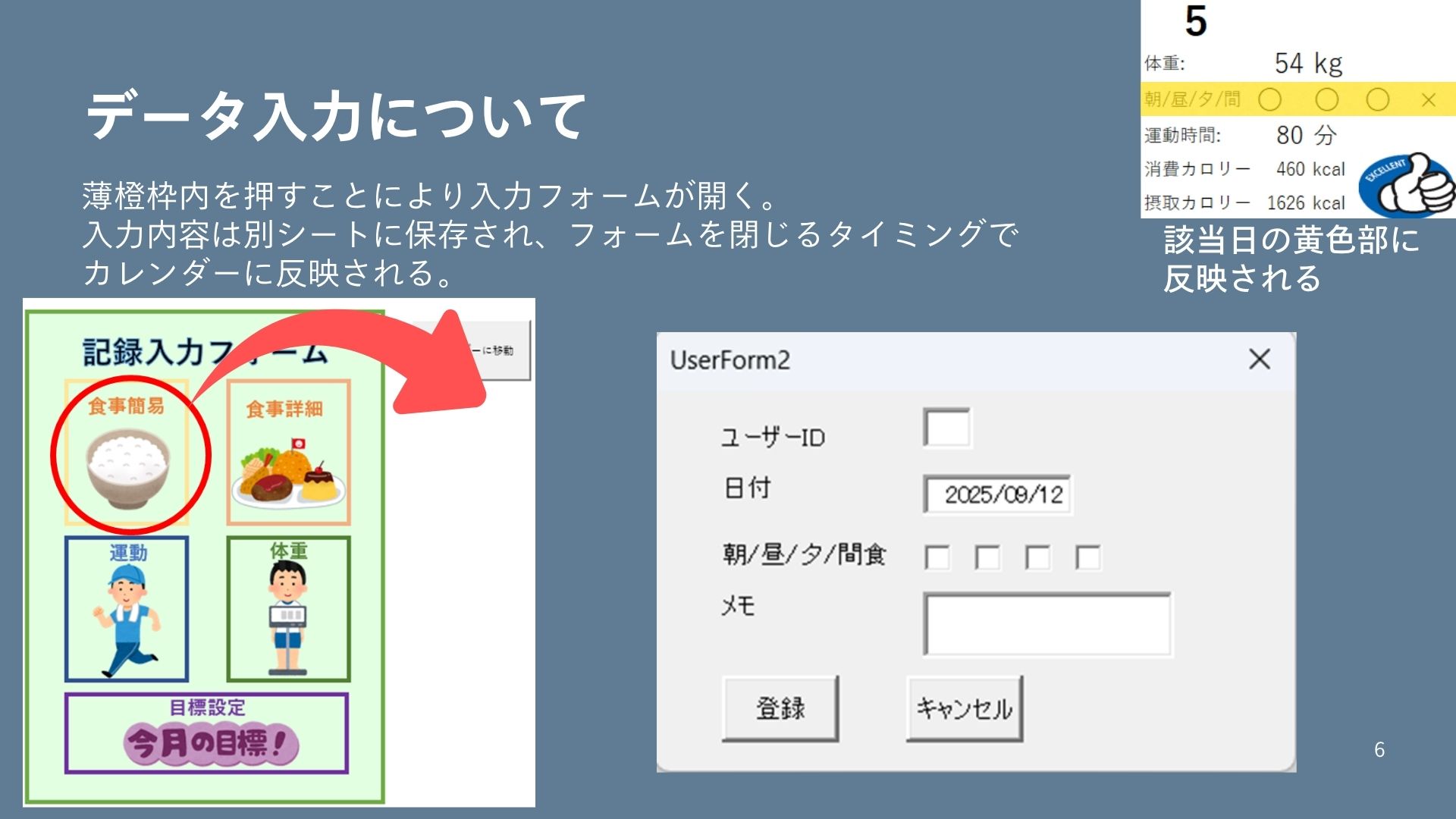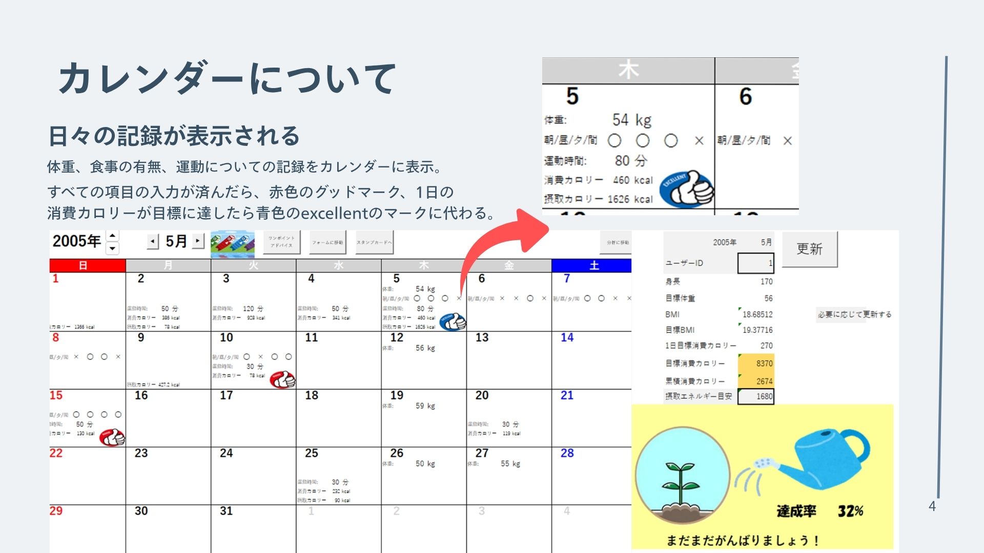 ユーザーの身長や体重などの情報をもち、食事や運動などのデータを随時入力し、記録することができる。ユーザーごとにデータを分析できるようデータの集計が可能。日常的に利用でき、モチベーション維持ができる。
