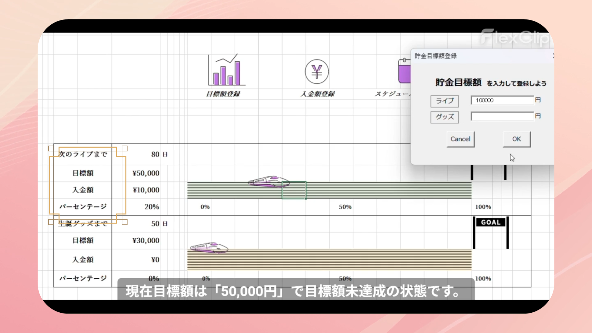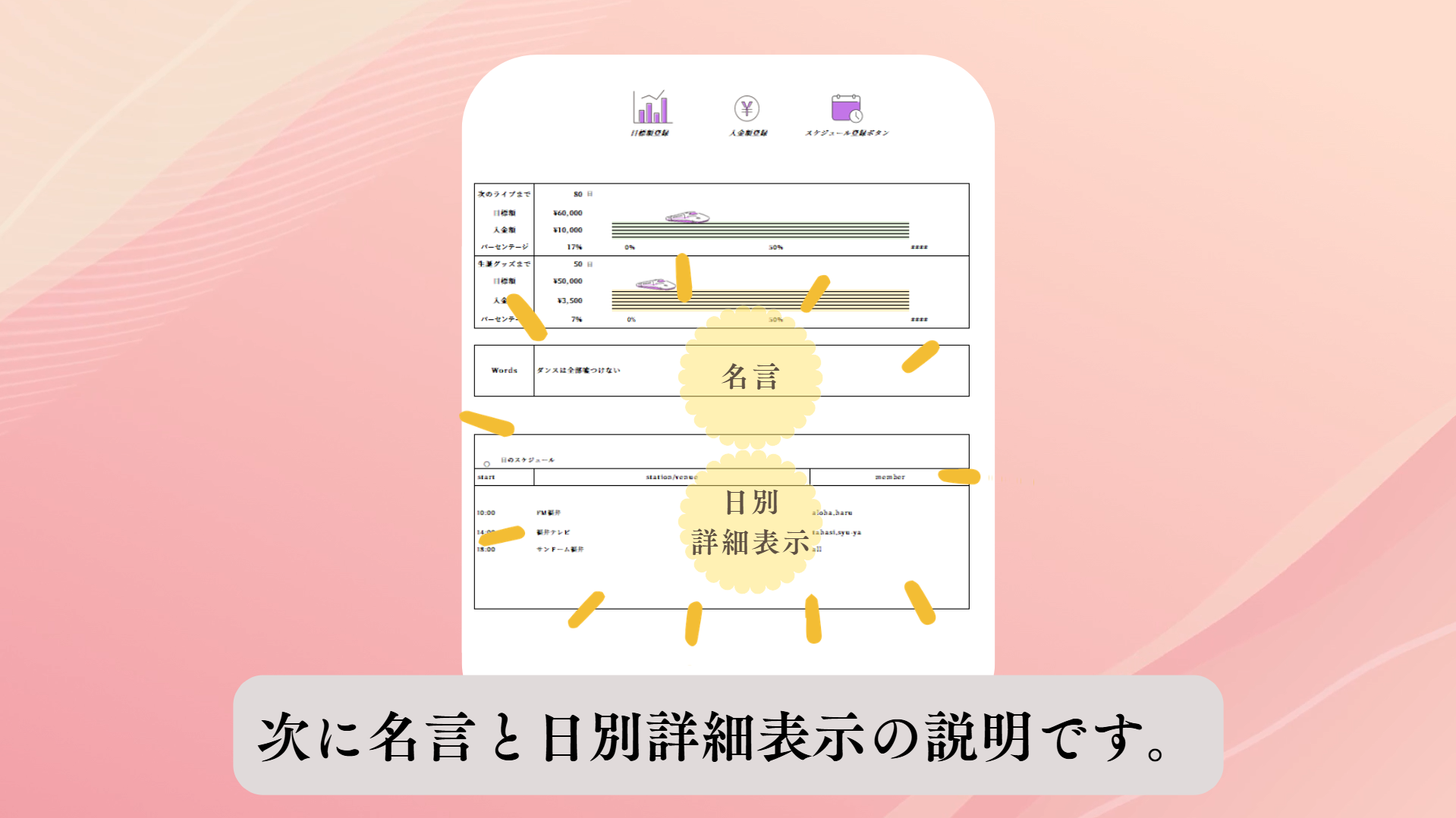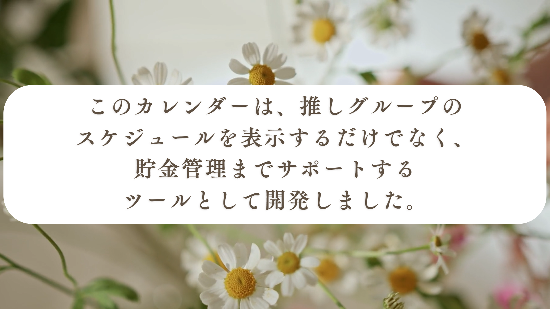 推し活のためのスケジュール確認と貯金をすることができます。貯金目標額設定と入金額の確認ができ、達成率に合わせ新幹線が移動する使用になっているので、貯金のモチベーションを保つことができます。BGM機能もつけたので、カレンダー確認中も曲を楽しむことができます。
