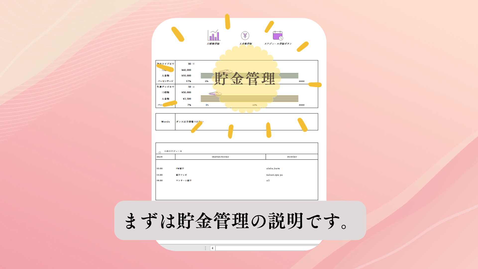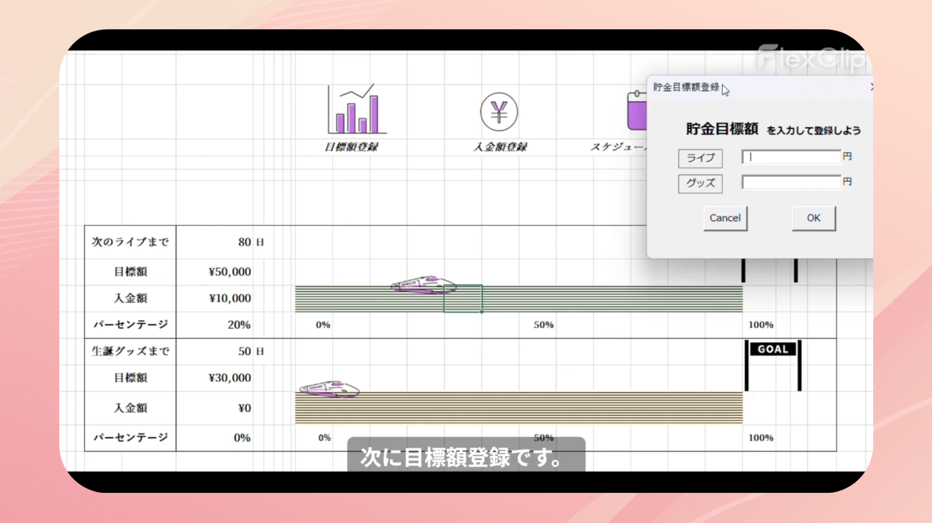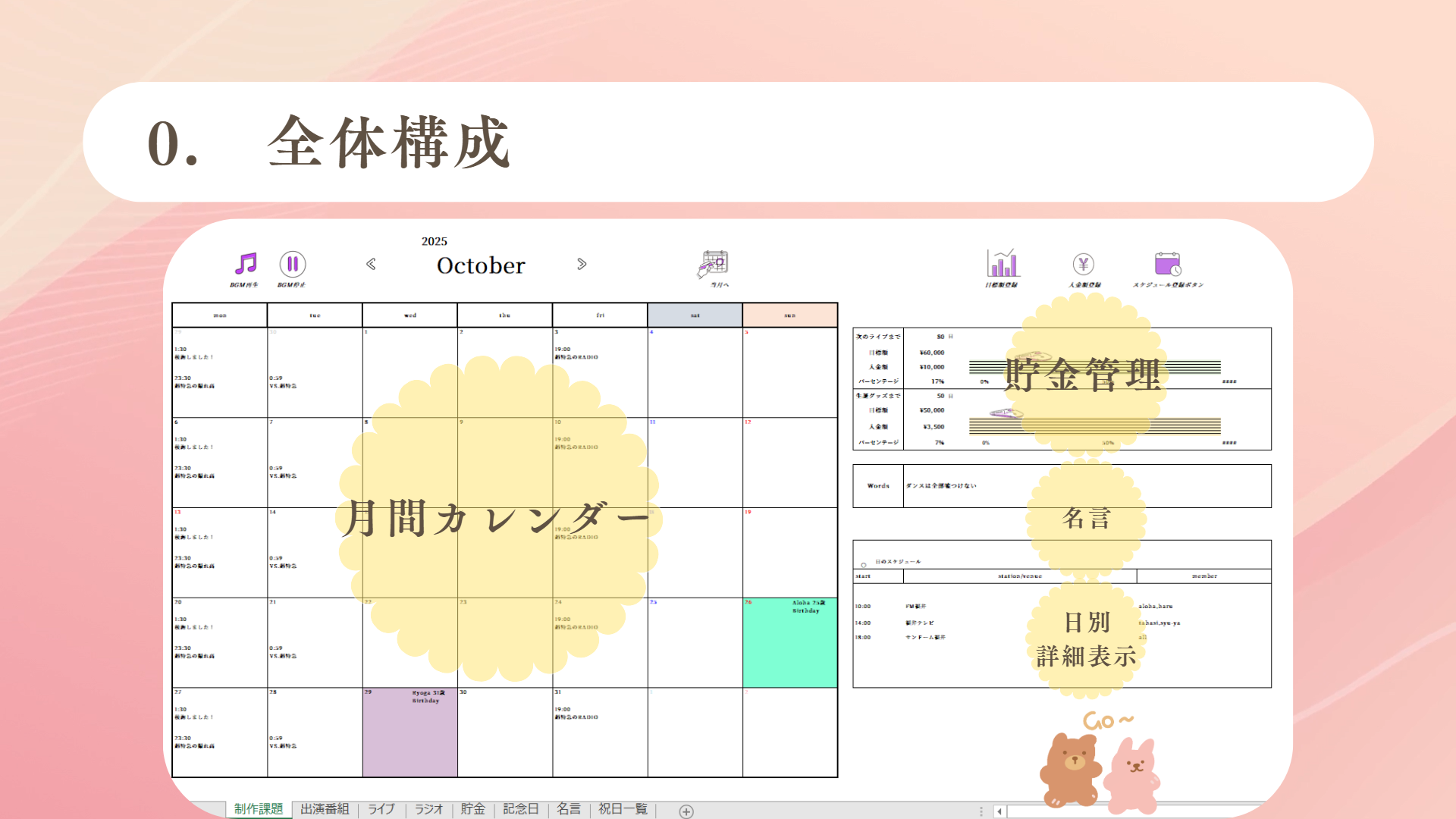 推し活のためのスケジュール確認と貯金をすることができます。貯金目標額設定と入金額の確認ができ、達成率に合わせ新幹線が移動する使用になっているので、貯金のモチベーションを保つことができます。BGM機能もつけたので、カレンダー確認中も曲を楽しむことができます。