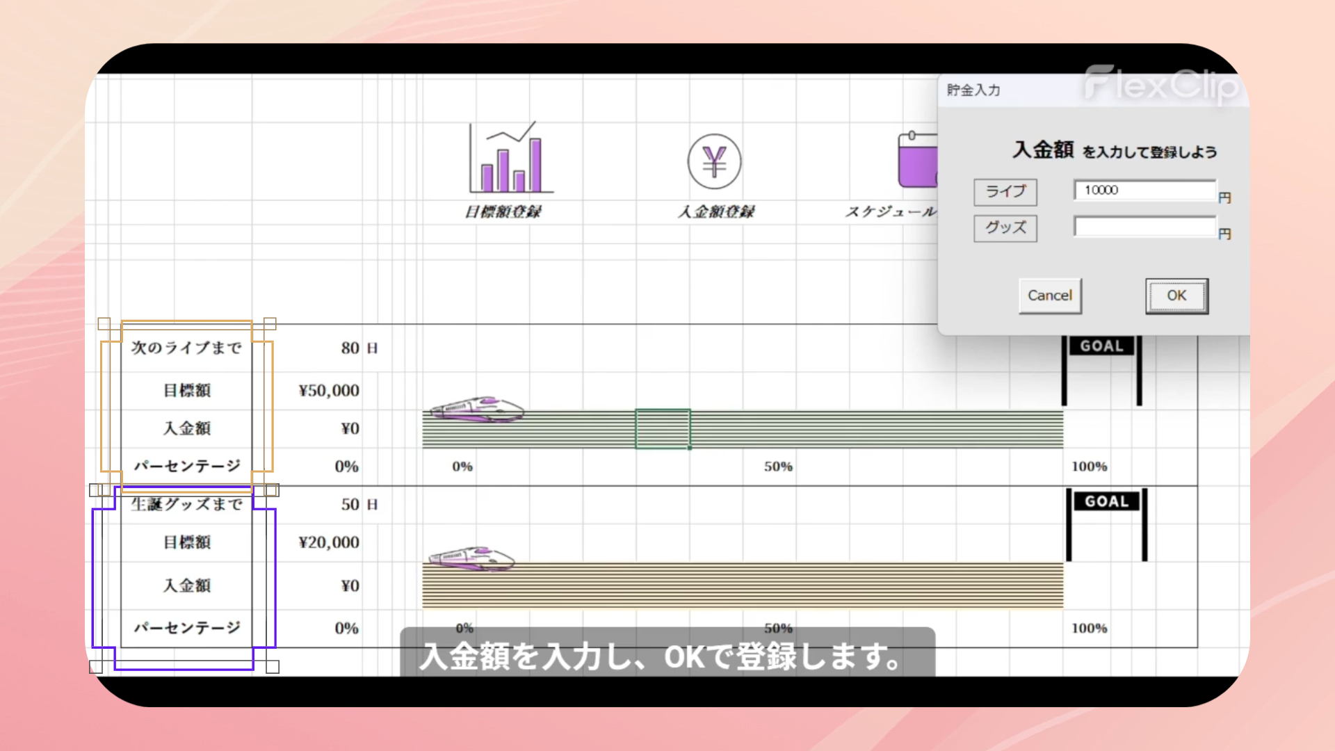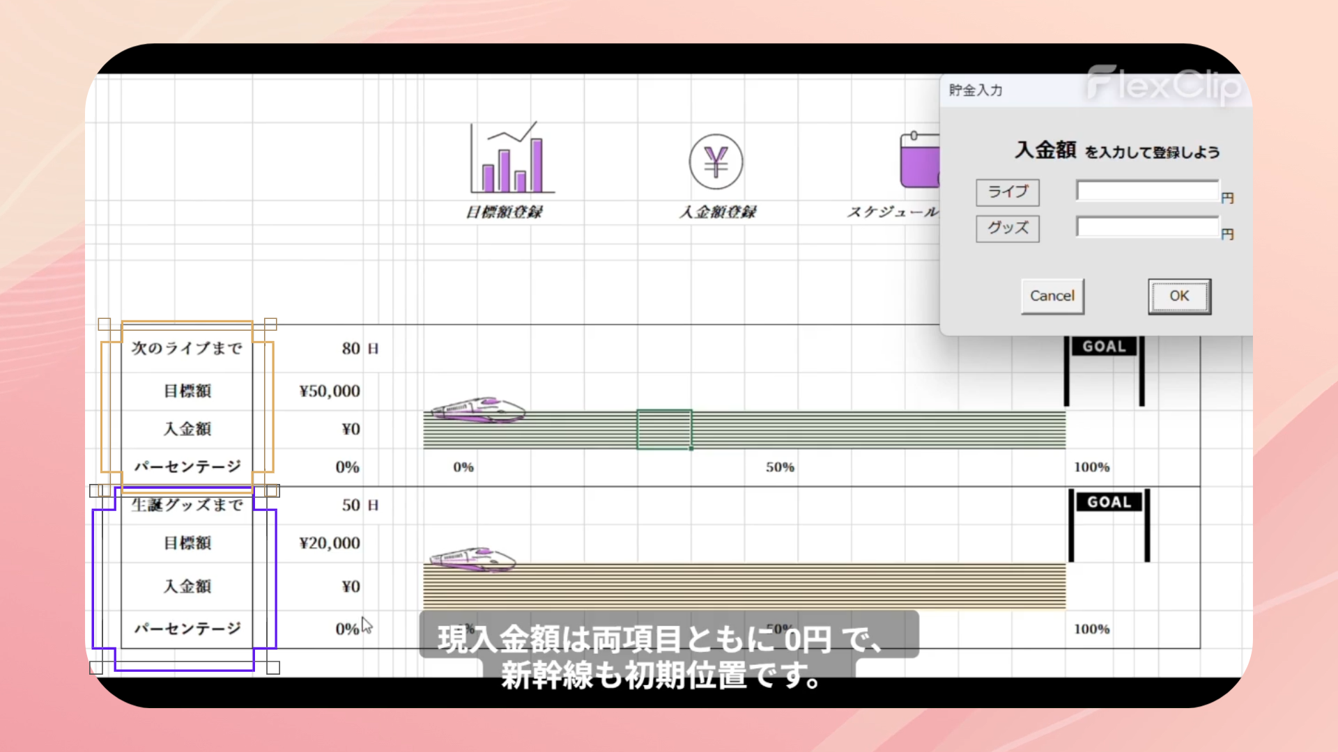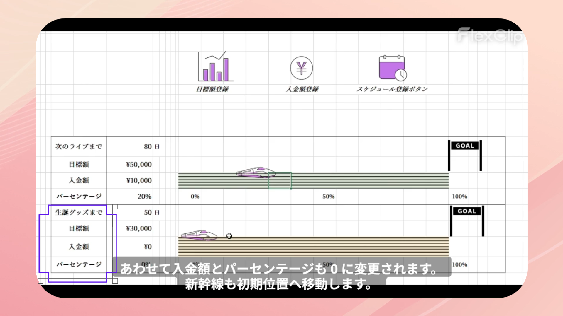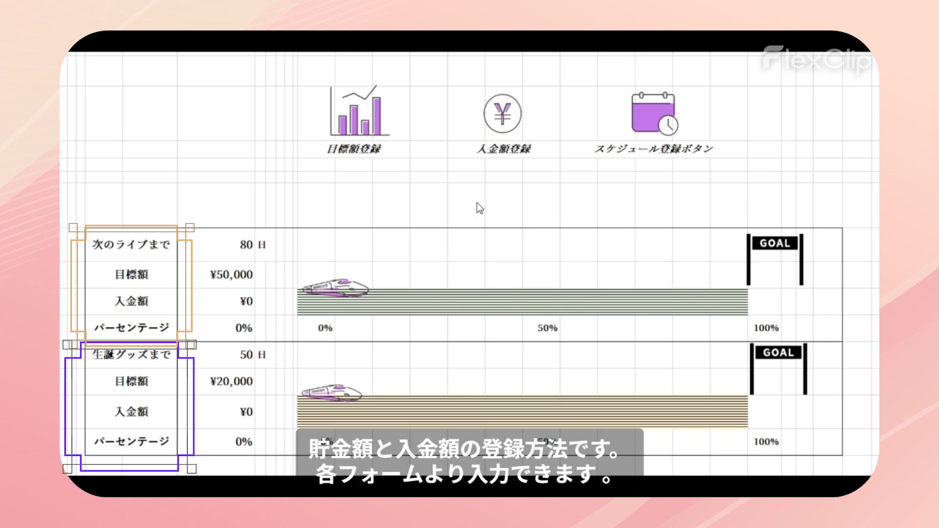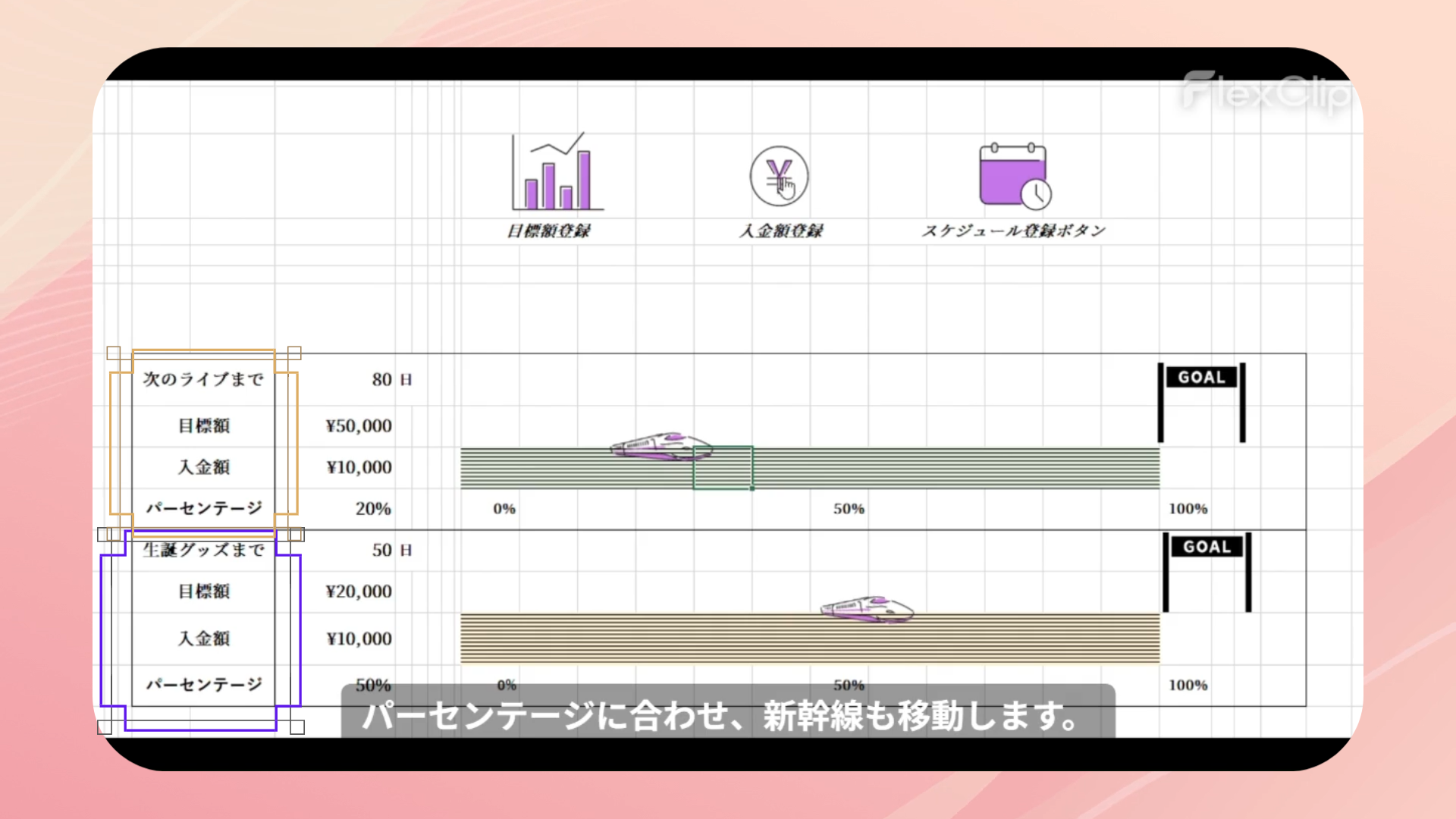 スケジュール管理、貯金管理、モチベーション維持という3つの要素を1つにまとめることで、毎日開きたくなるカレンダーを目指しました。次回イベントまでの必要額を設定し確実に貯まるよう、瞬時に目に見える形で表現できるとよいと考え制作しました。貯金額達成率を新幹線の移動幅と紐づけました。楽しく推し活と貯金が出来るようデザインにもこだわりました。