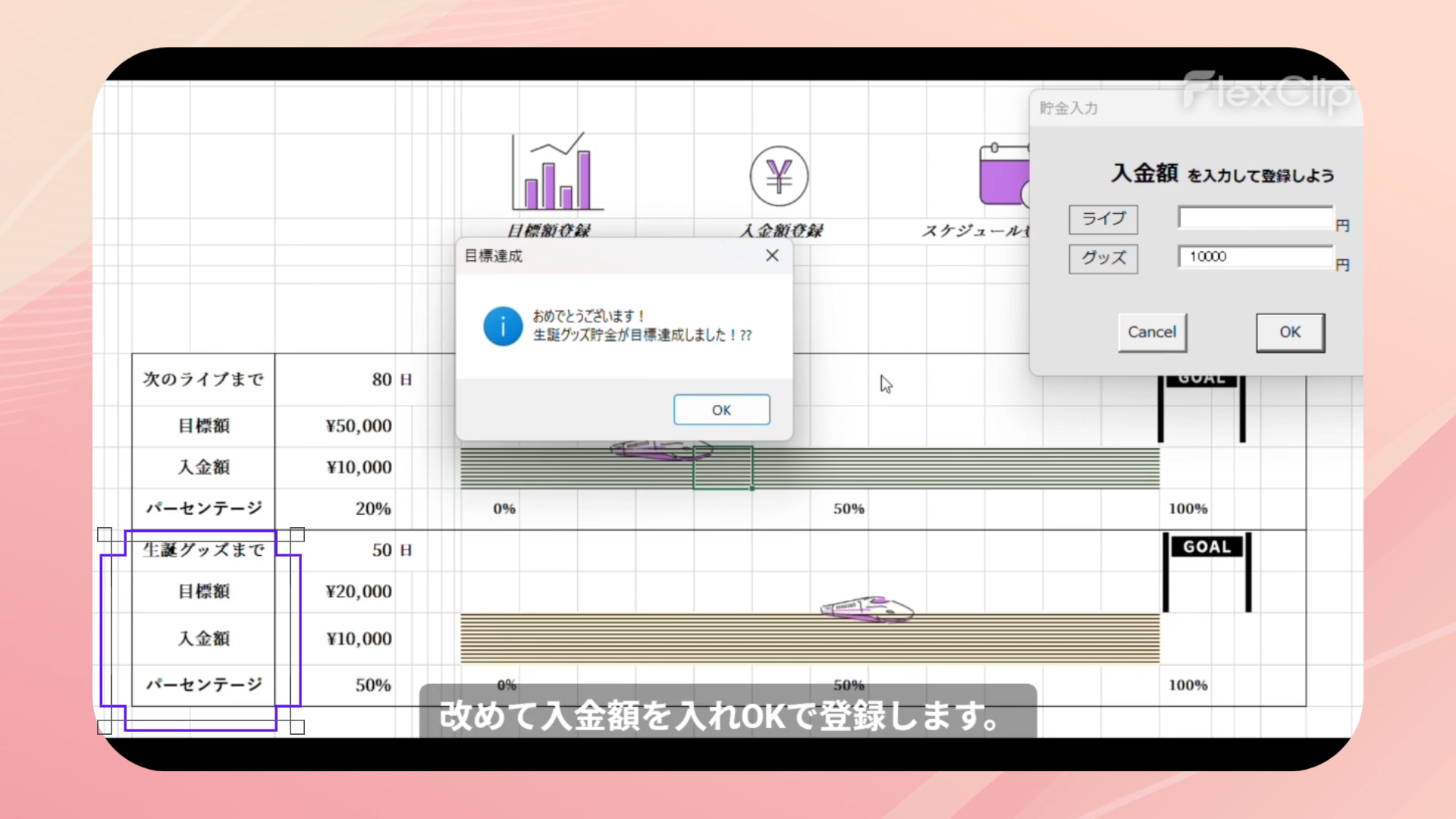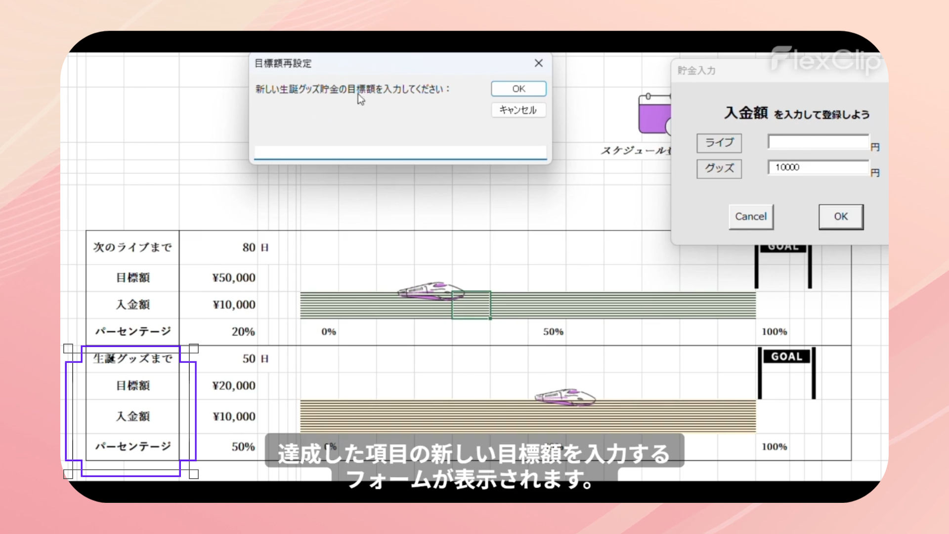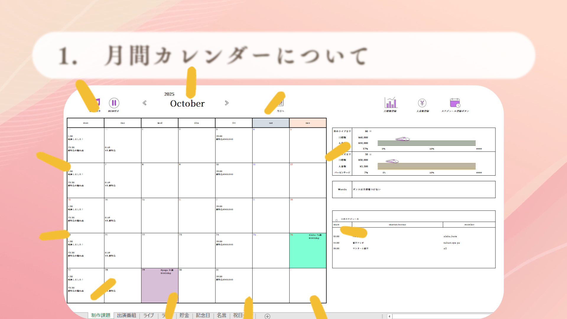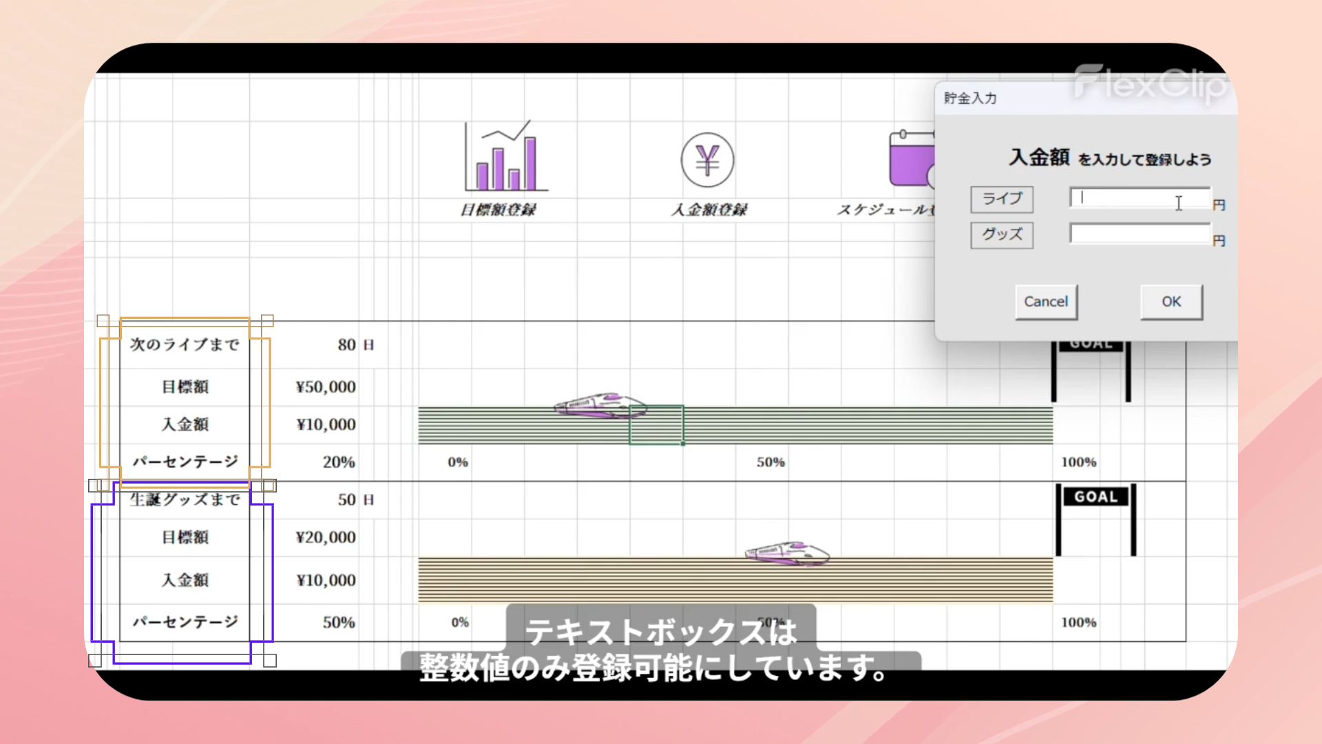 スケジュール管理、貯金管理、モチベーション維持という3つの要素を1つにまとめることで、毎日開きたくなるカレンダーを目指しました。次回イベントまでの必要額を設定し確実に貯まるよう、瞬時に目に見える形で表現できるとよいと考え制作しました。貯金額達成率を新幹線の移動幅と紐づけました。楽しく推し活と貯金が出来るようデザインにもこだわりました。