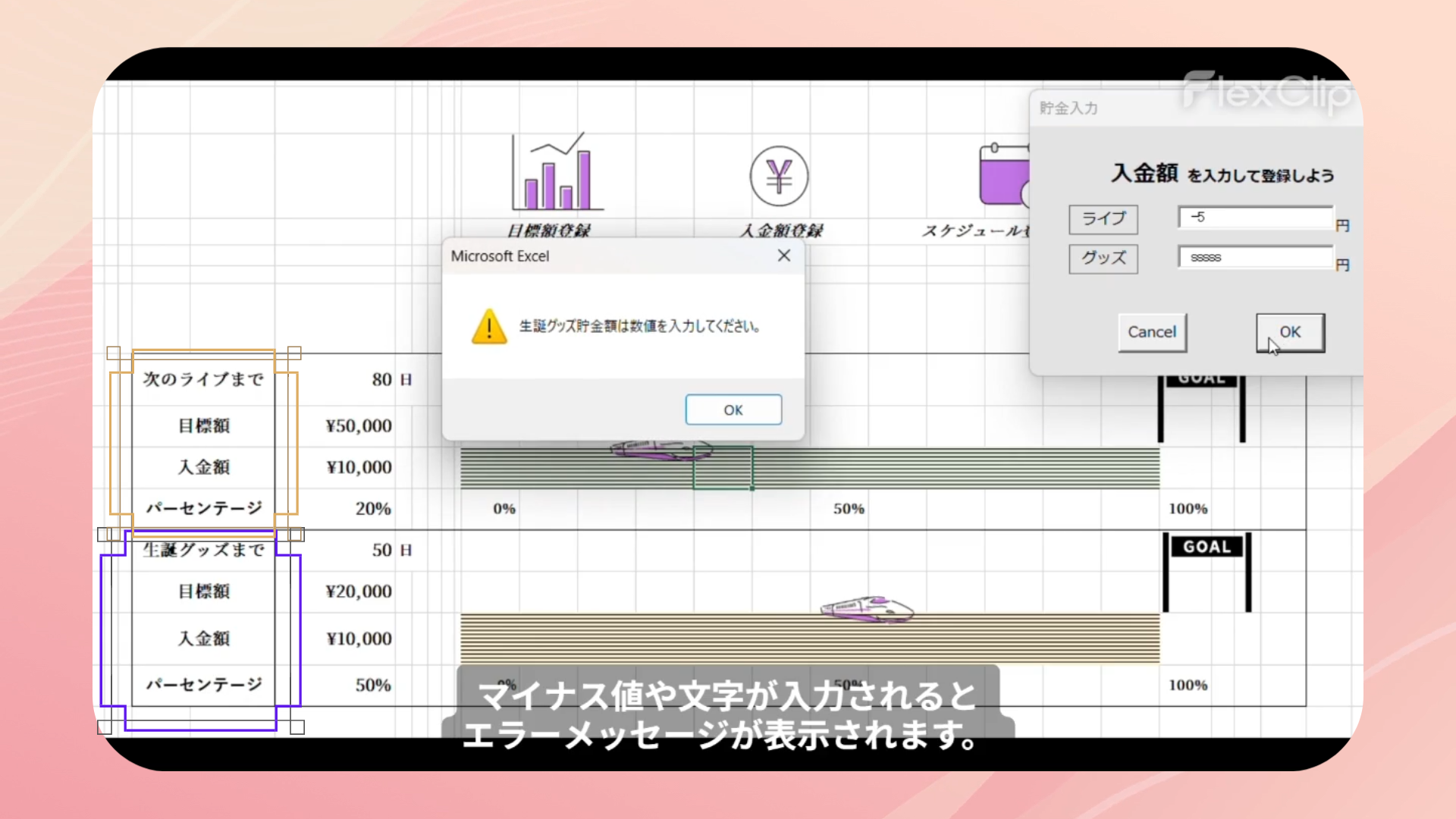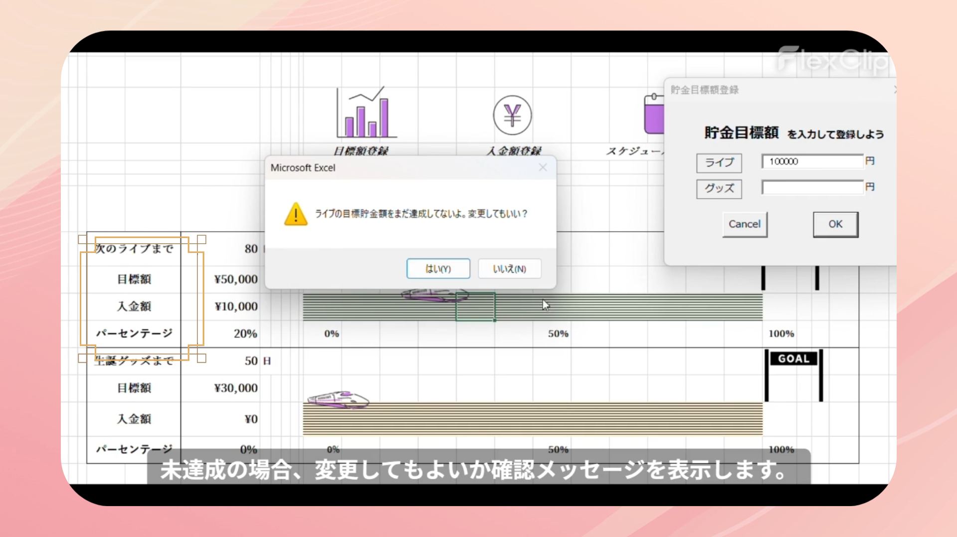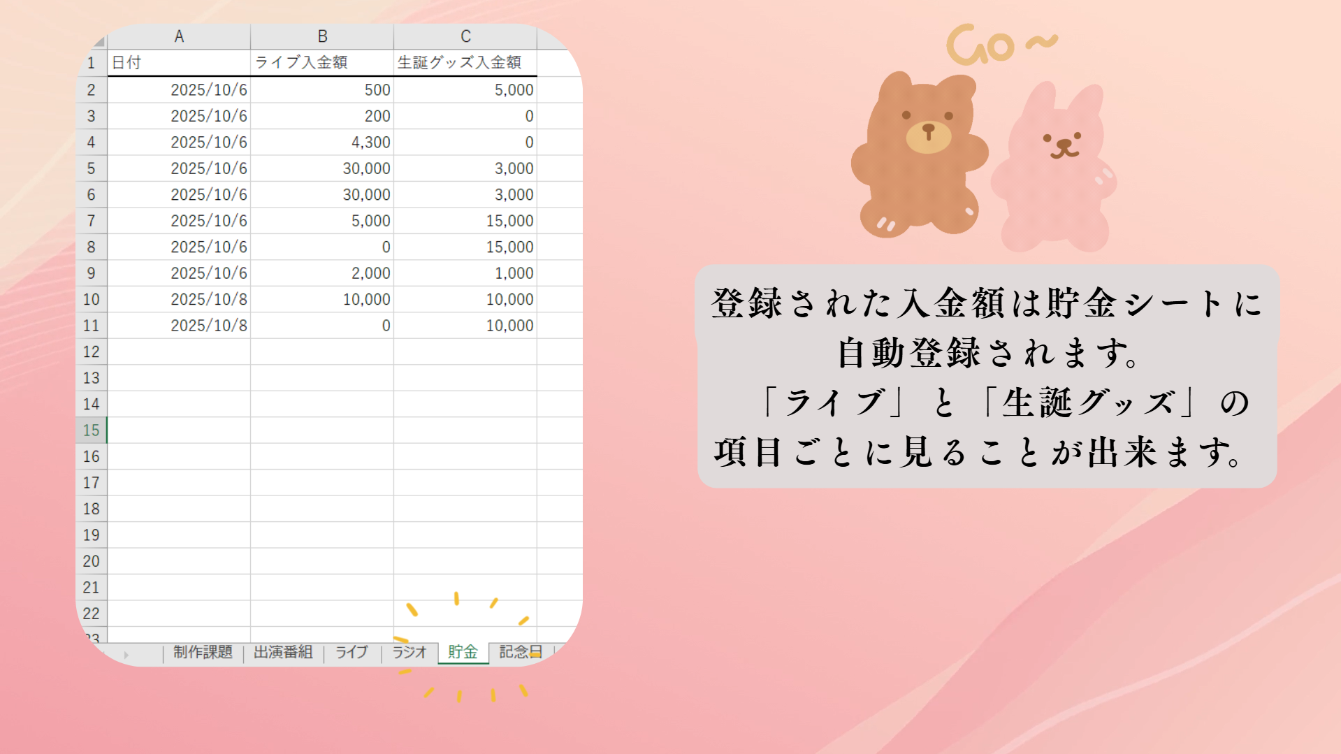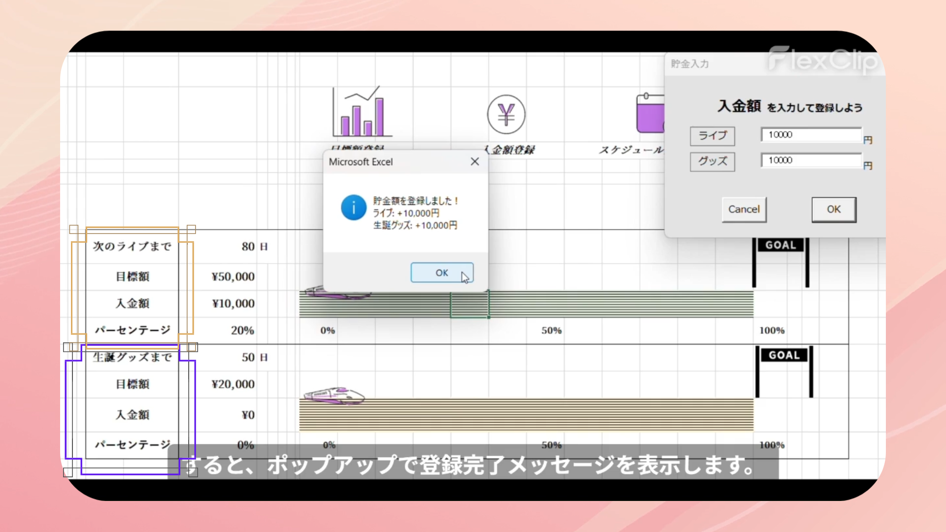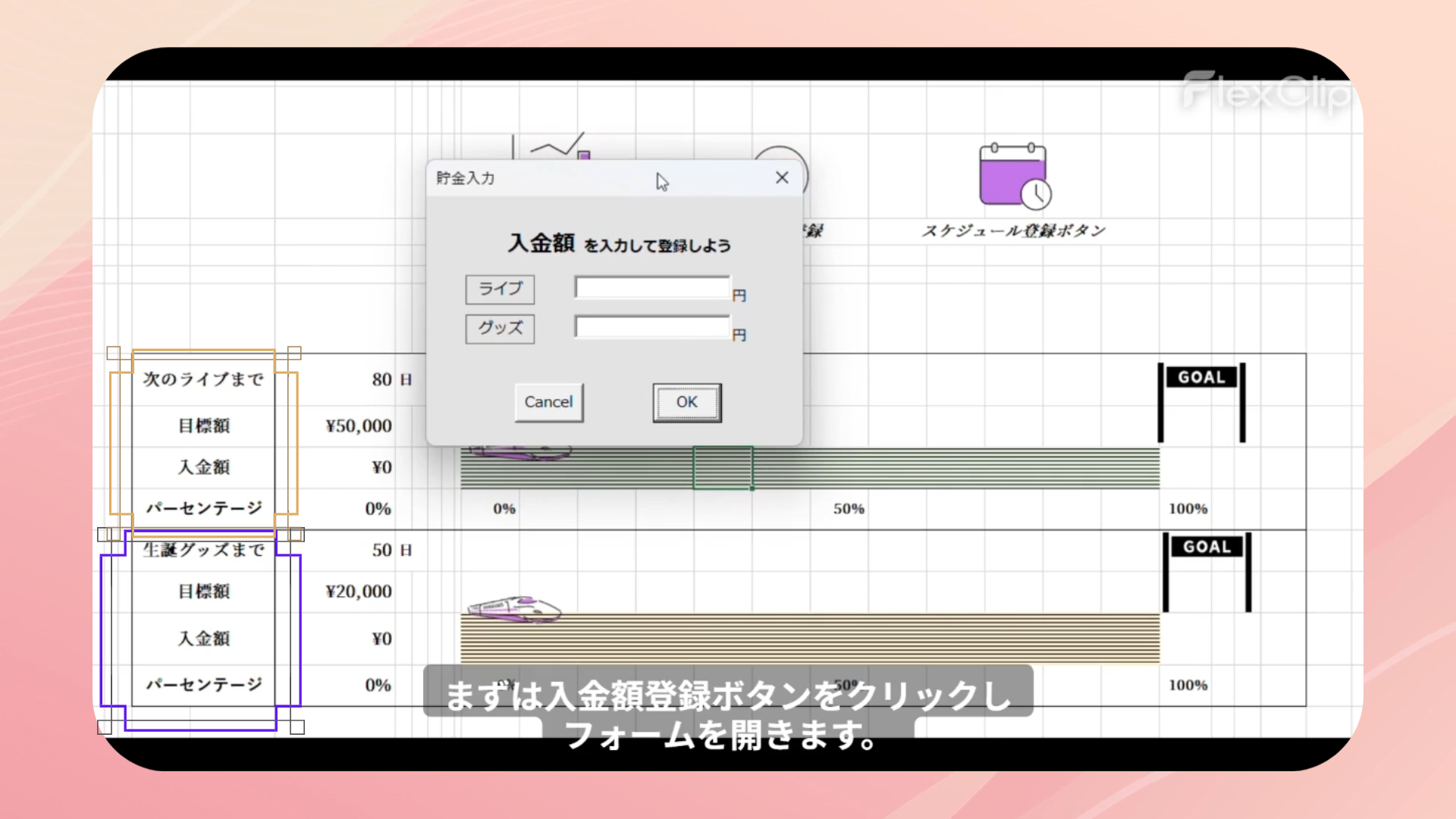 スケジュール管理、貯金管理、モチベーション維持という3つの要素を1つにまとめることで、毎日開きたくなるカレンダーを目指しました。次回イベントまでの必要額を設定し確実に貯まるよう、瞬時に目に見える形で表現できるとよいと考え制作しました。貯金額達成率を新幹線の移動幅と紐づけました。楽しく推し活と貯金が出来るようデザインにもこだわりました。