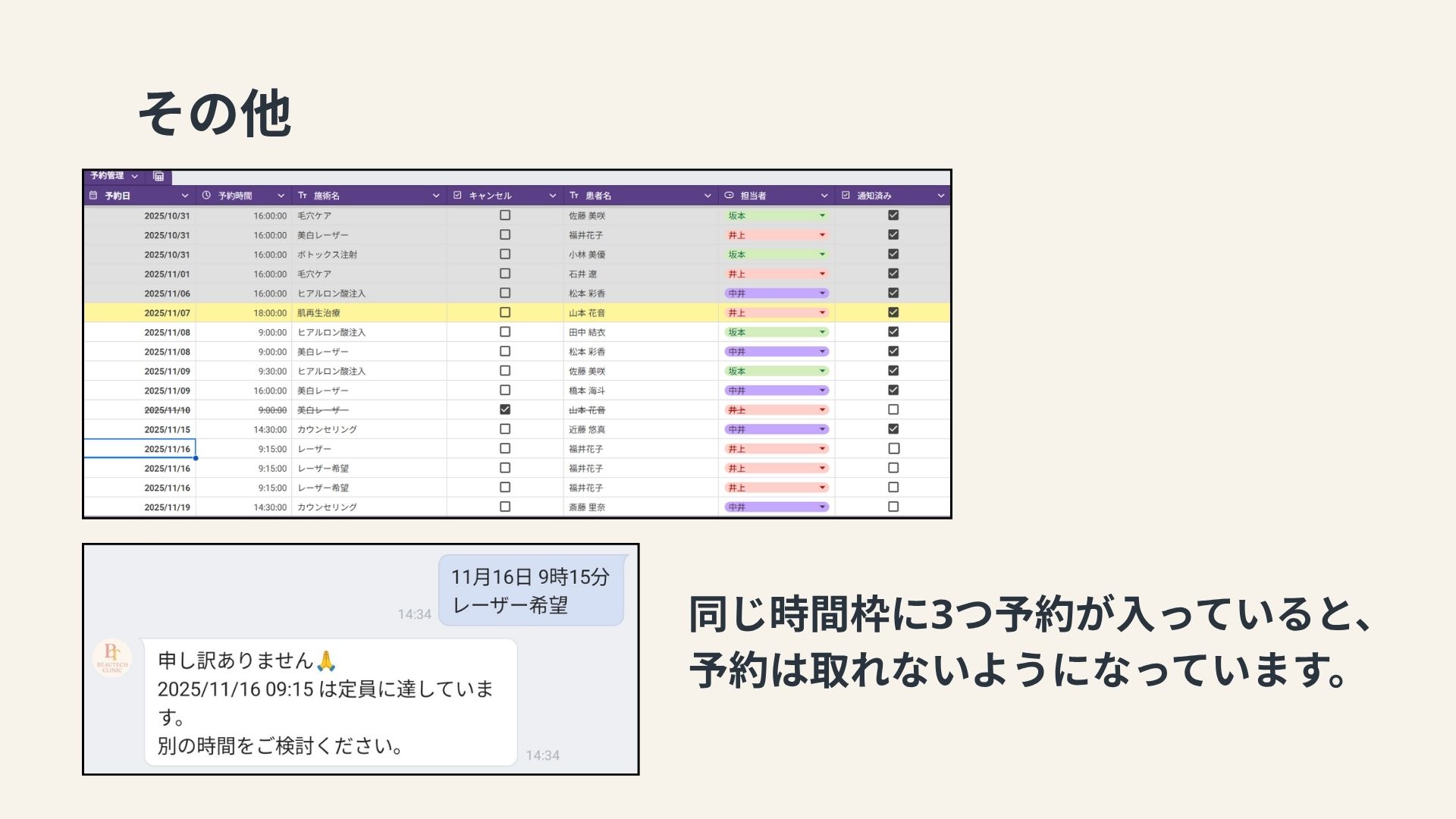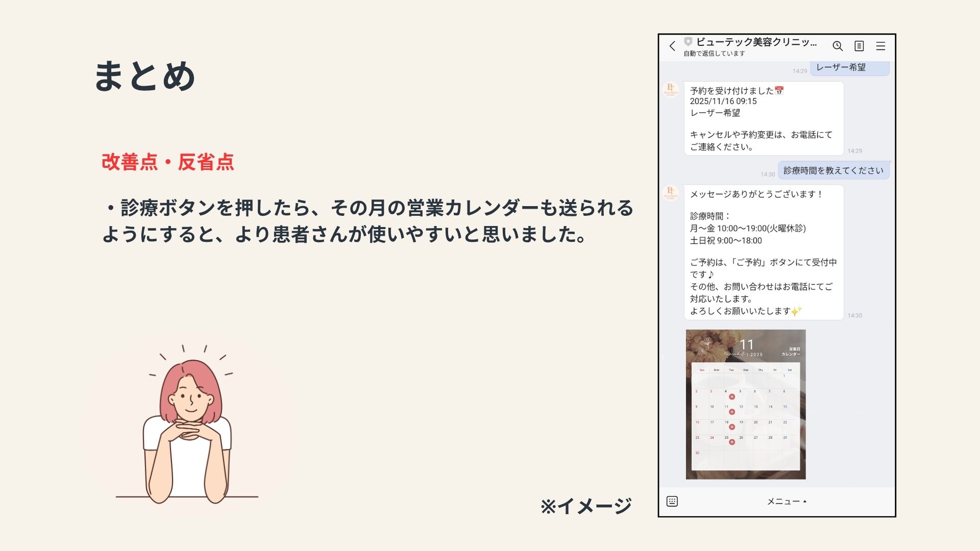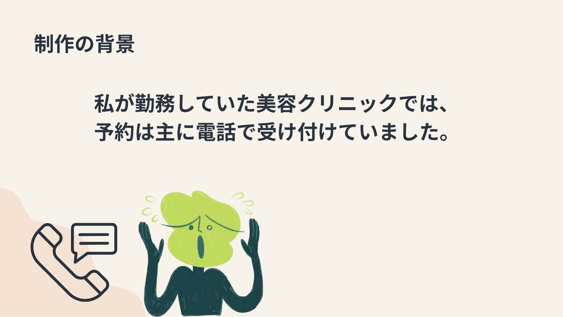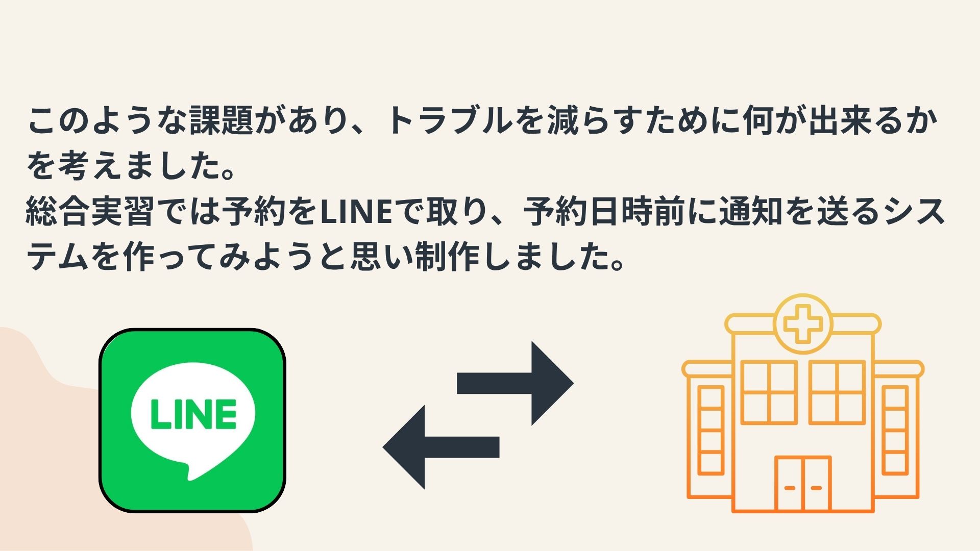 私が勤務していた美容クリニックでは、予約は主に電話で受け付けていました。しかし、予約に関するトラブルが頻発していました。このようなトラブルを防ぐためには、予約内容の確認を複数の手段で行うことや記録を残す仕組みの導入が求められます。トラブルを減らすために何が出来るかを考え、総合実習では予約をLINEで取り、予約日時前に通知を送るシステムを作ってみようと思い制作しました。