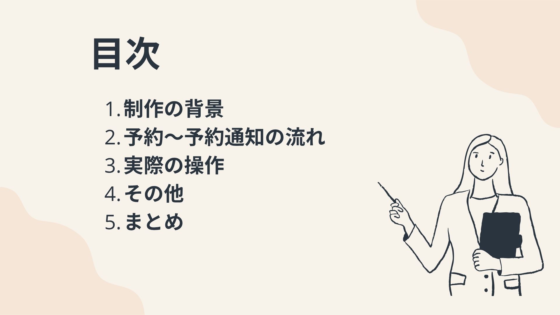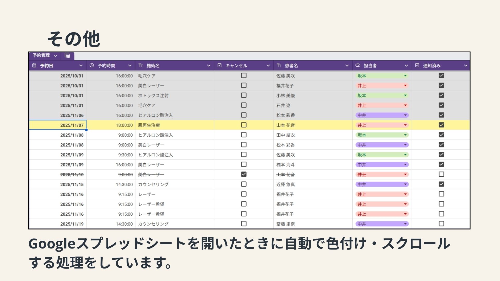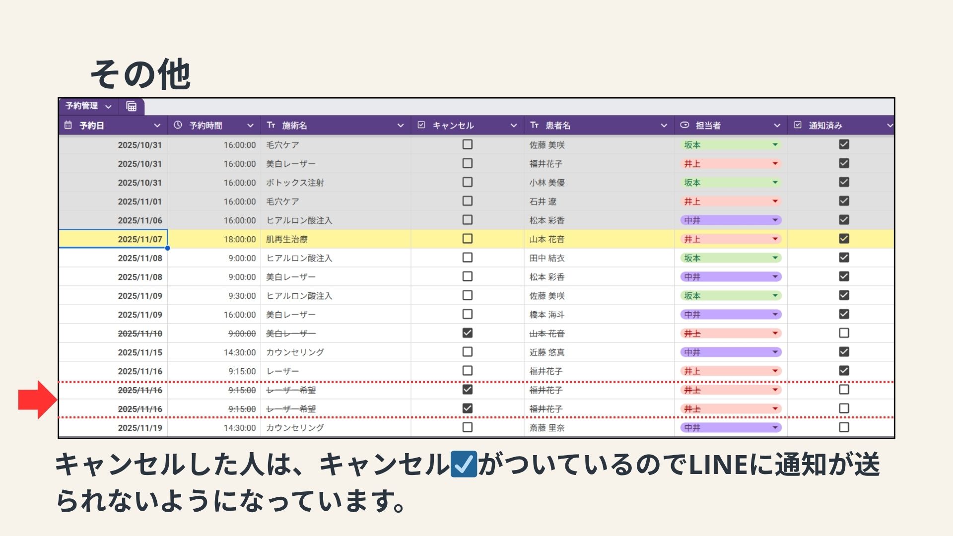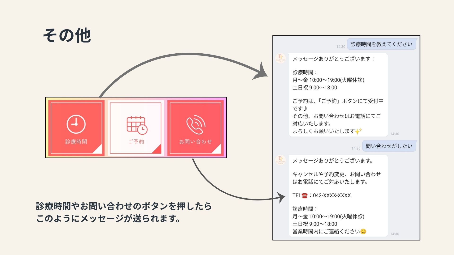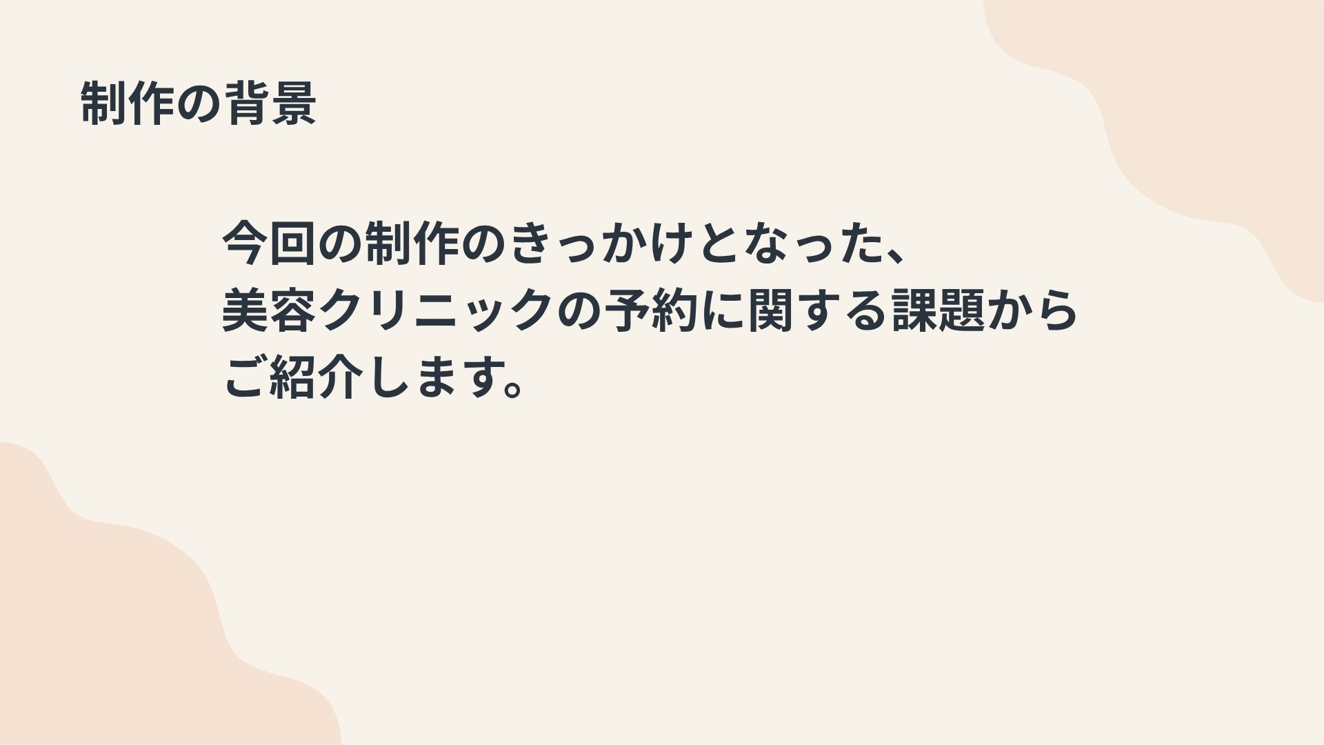 私が勤務していた美容クリニックでは、予約は主に電話で受け付けていました。しかし、予約に関するトラブルが頻発していました。このようなトラブルを防ぐためには、予約内容の確認を複数の手段で行うことや記録を残す仕組みの導入が求められます。トラブルを減らすために何が出来るかを考え、総合実習では予約をLINEで取り、予約日時前に通知を送るシステムを作ってみようと思い制作しました。