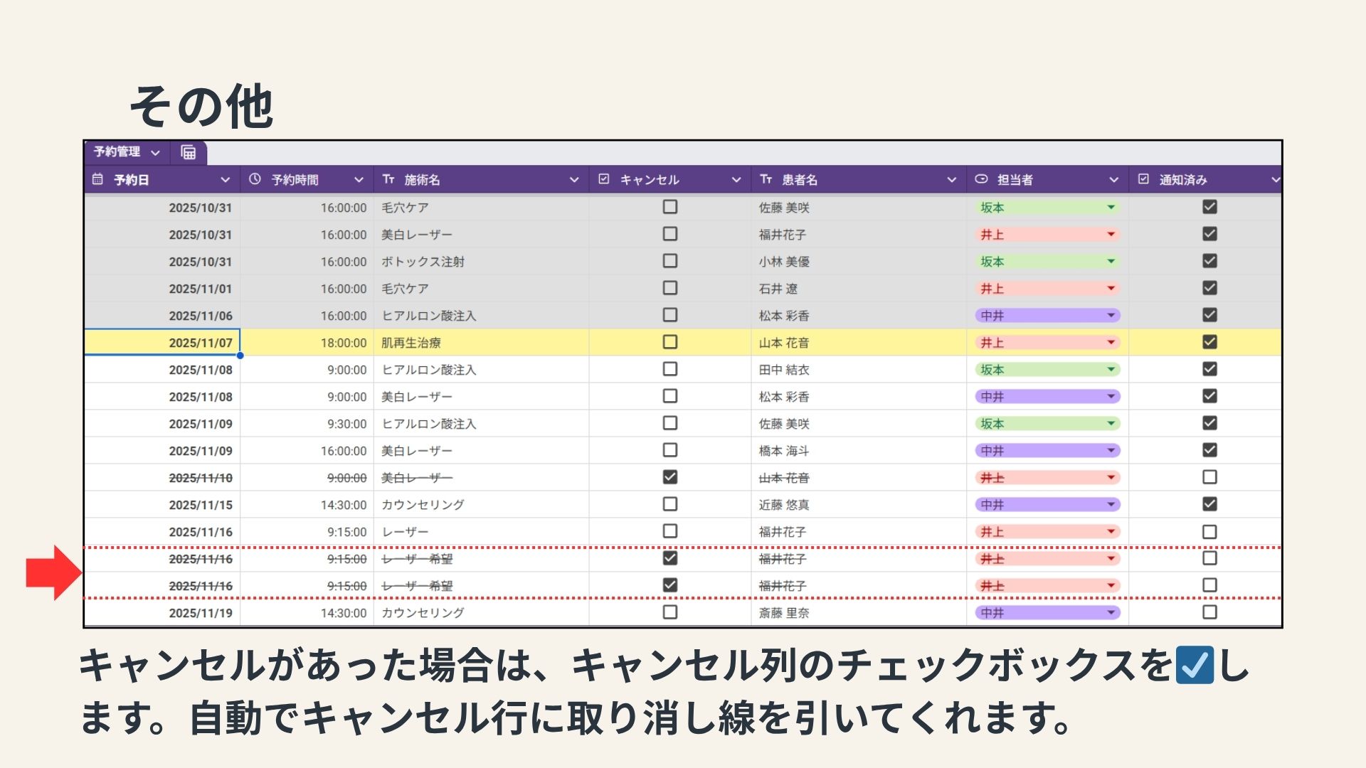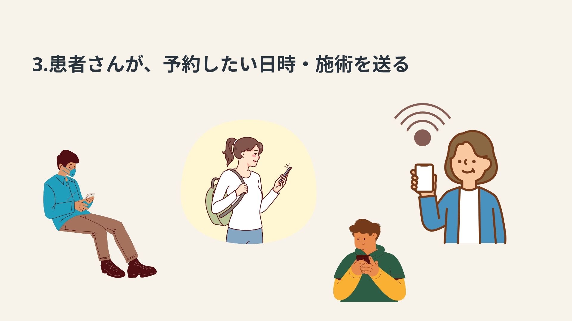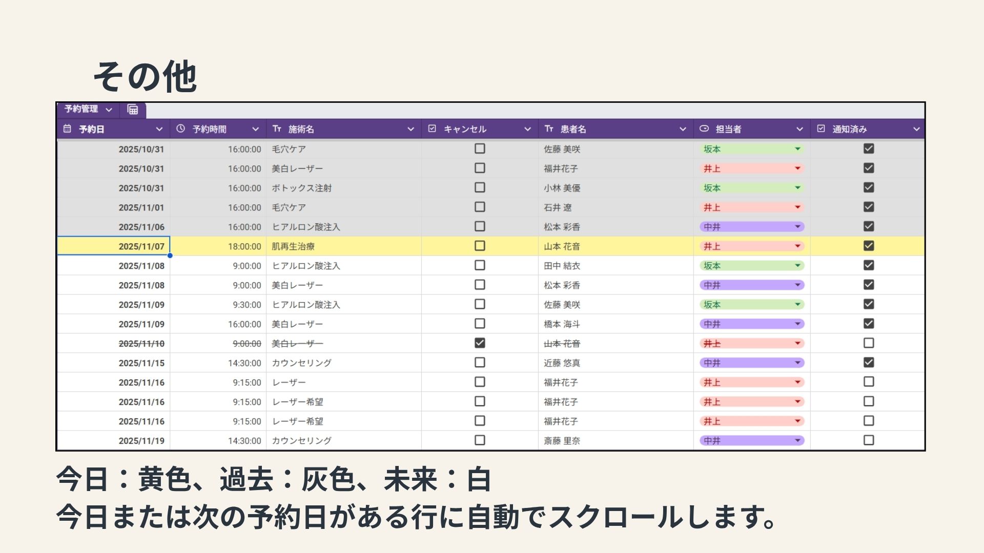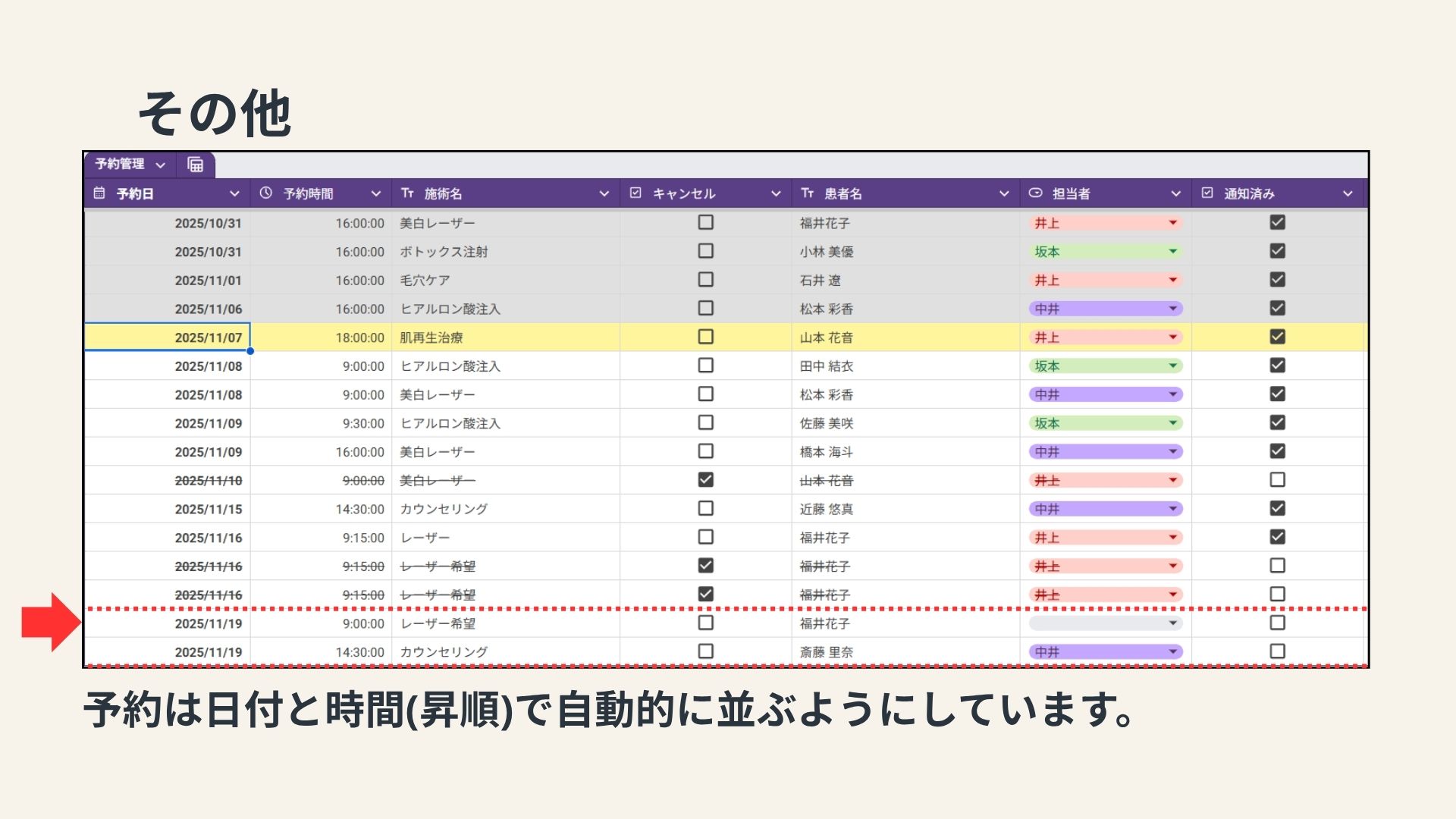私が勤務していた美容クリニックでは、予約は主に電話で受け付けていました。しかし、予約に関するトラブルが頻発していました。このようなトラブルを防ぐためには、予約内容の確認を複数の手段で行うことや記録を残す仕組みの導入が求められます。トラブルを減らすために何が出来るかを考え、総合実習では予約をLINEで取り、予約日時前に通知を送るシステムを作ってみようと思い制作しました。
