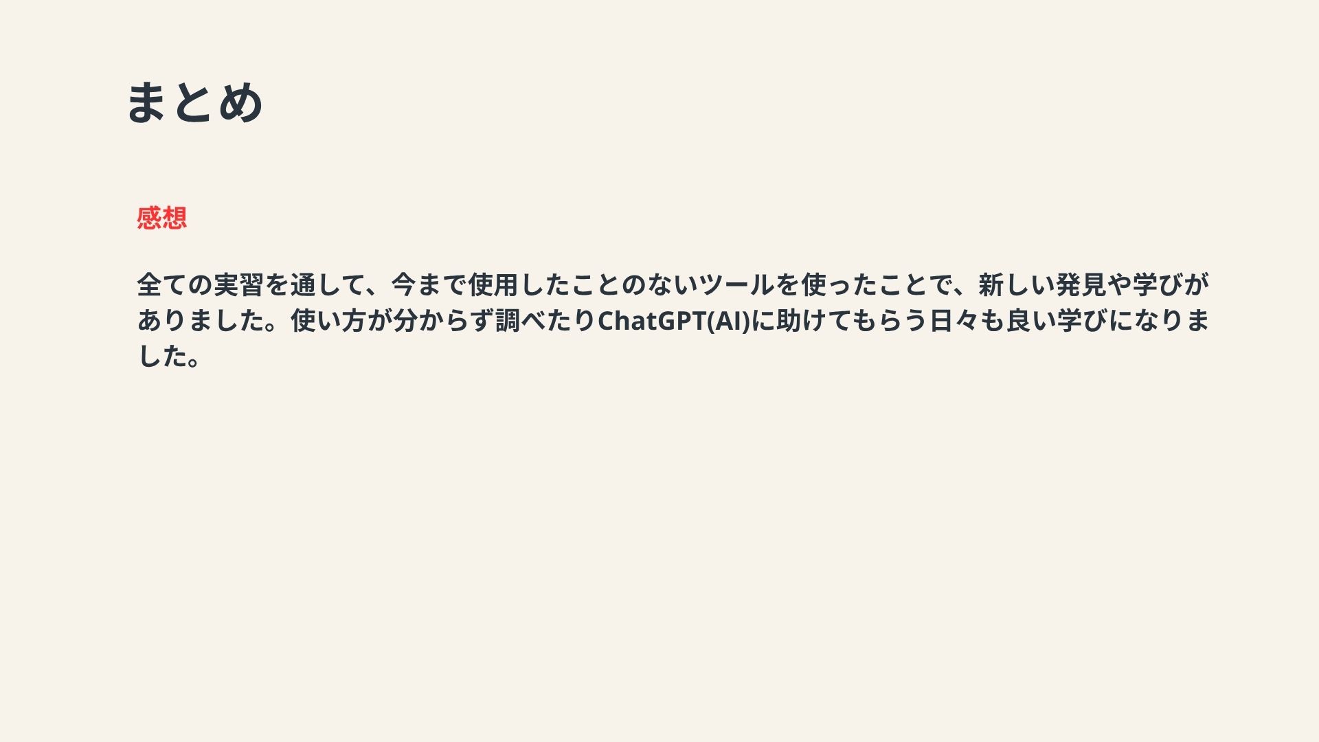 新しいことを学ぶことは大変ですが、自分の成長のためにこれからも続けていきたいと思いました。