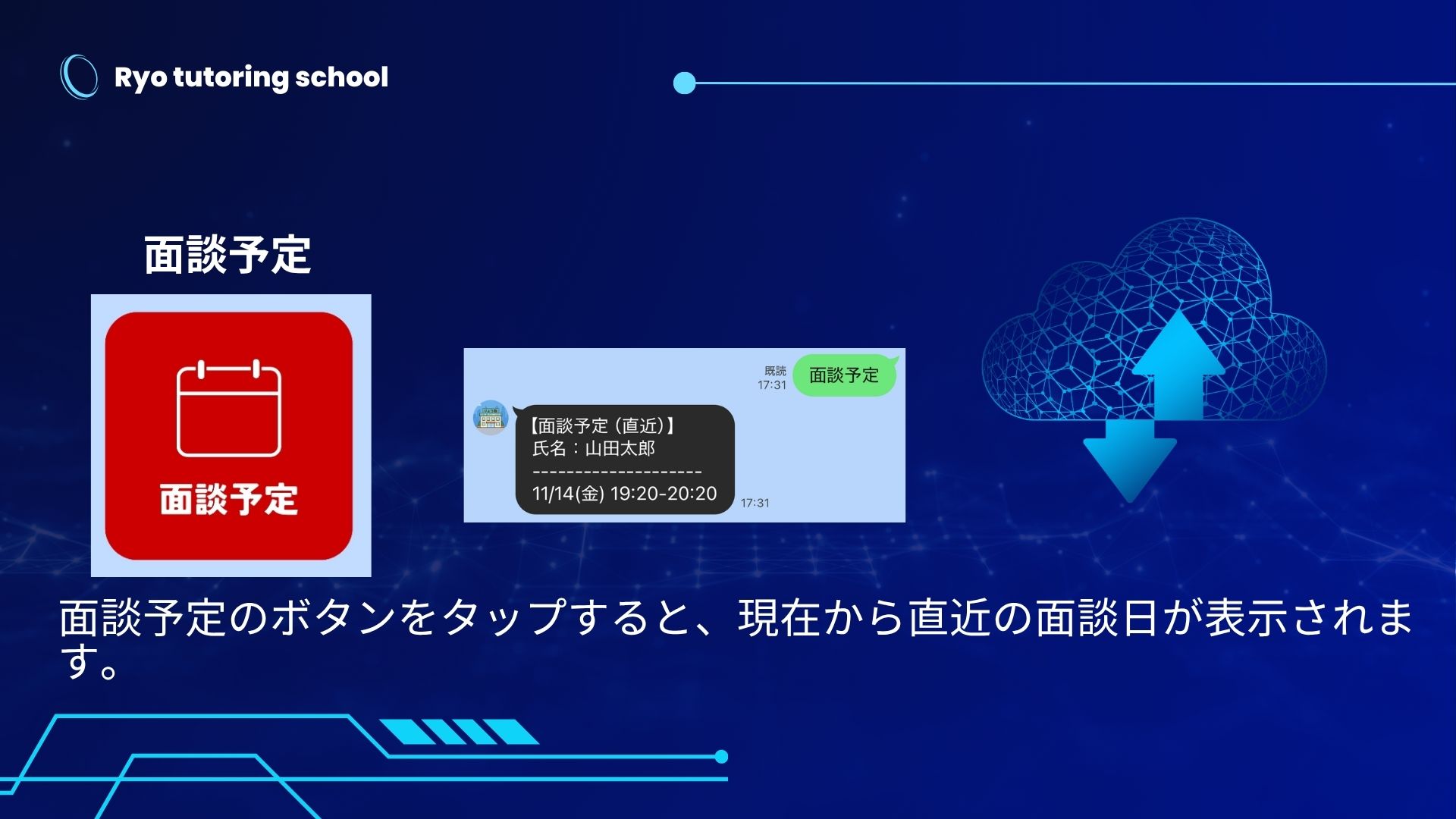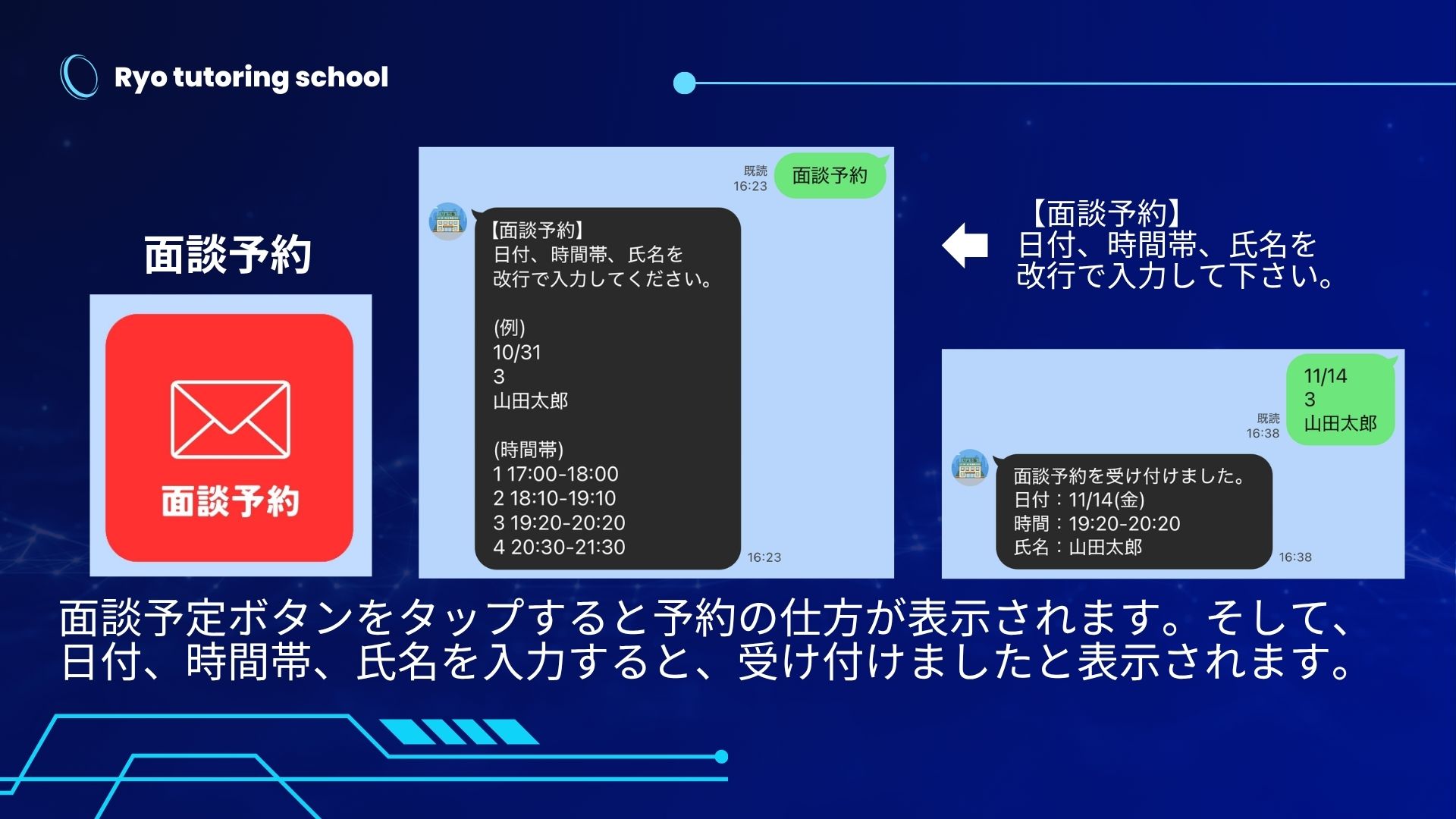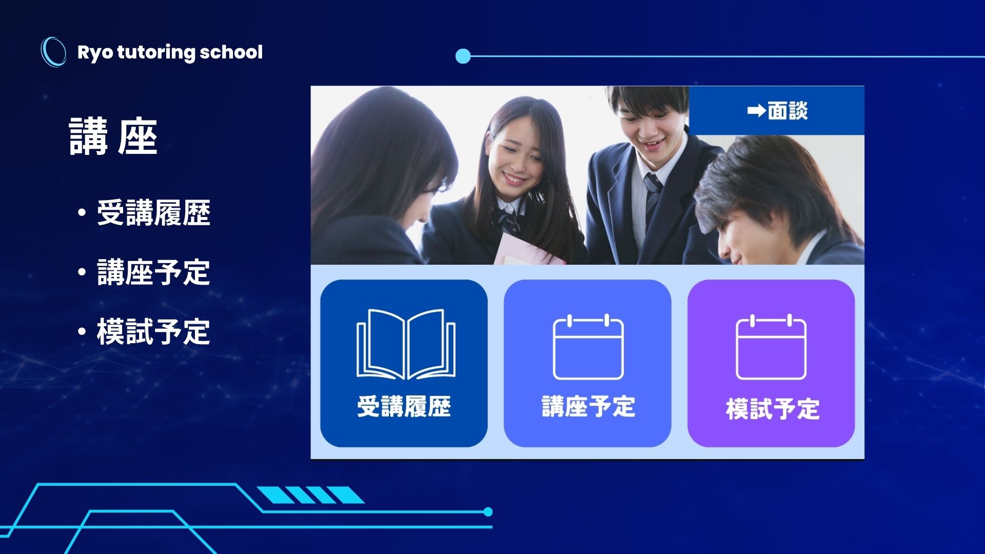 LINEにて、各講座における受講履歴を表示させることができます。また、今後の講座予定、模試予定も表示させることができます。一方、面談空枠を確認して、面談日を予約をすることができます。また、予約した面談日を面談予定で確認することができます。