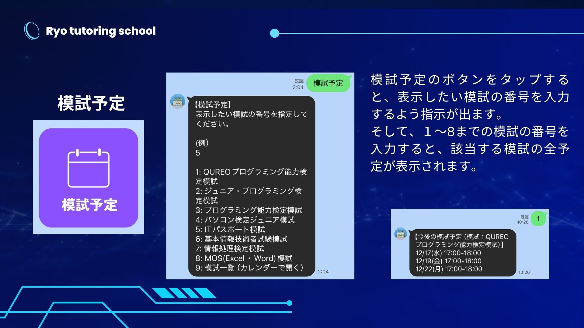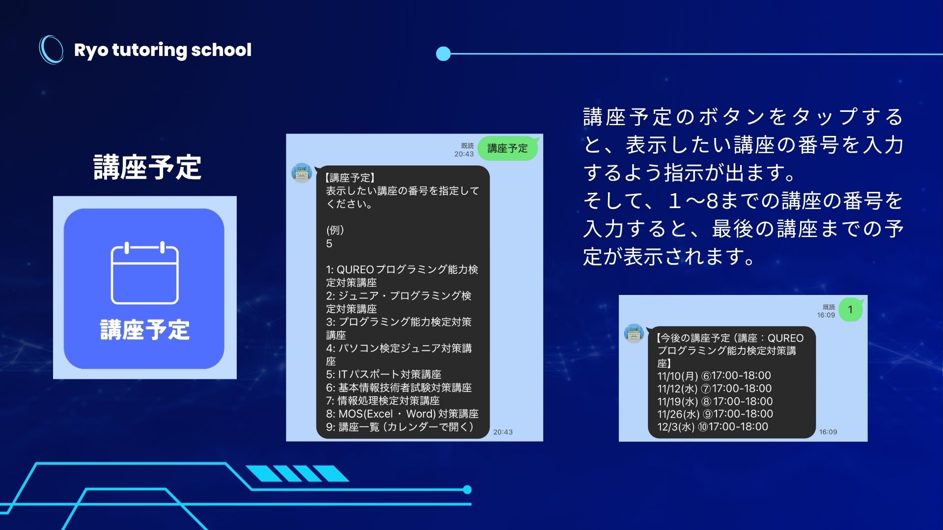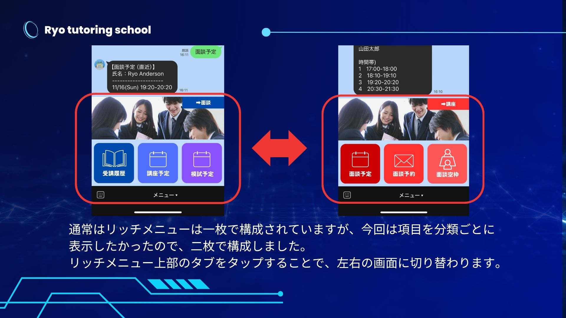 LINEにて、各講座における受講履歴を表示させることができます。また、今後の講座予定、模試予定も表示させることができます。一方、面談空枠を確認して、面談日を予約をすることができます。また、予約した面談日を面談予定で確認することができます。