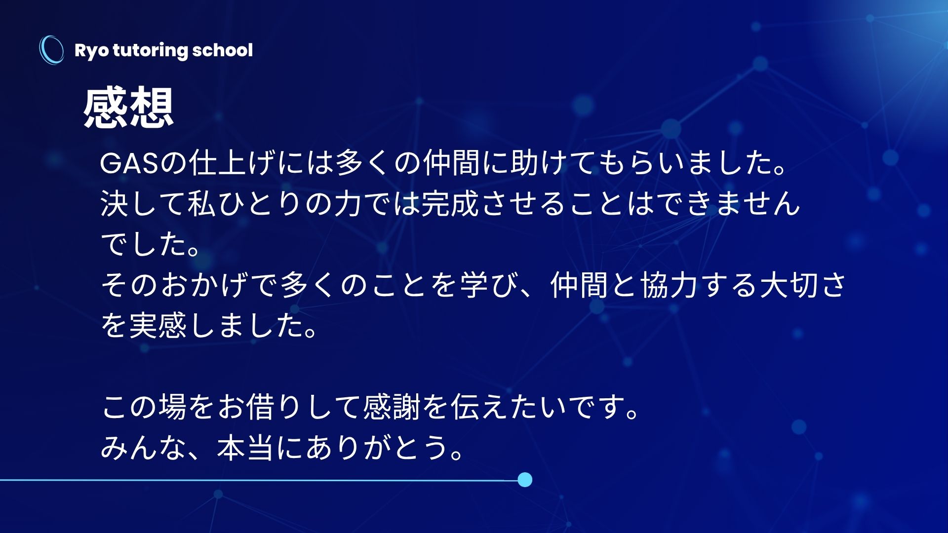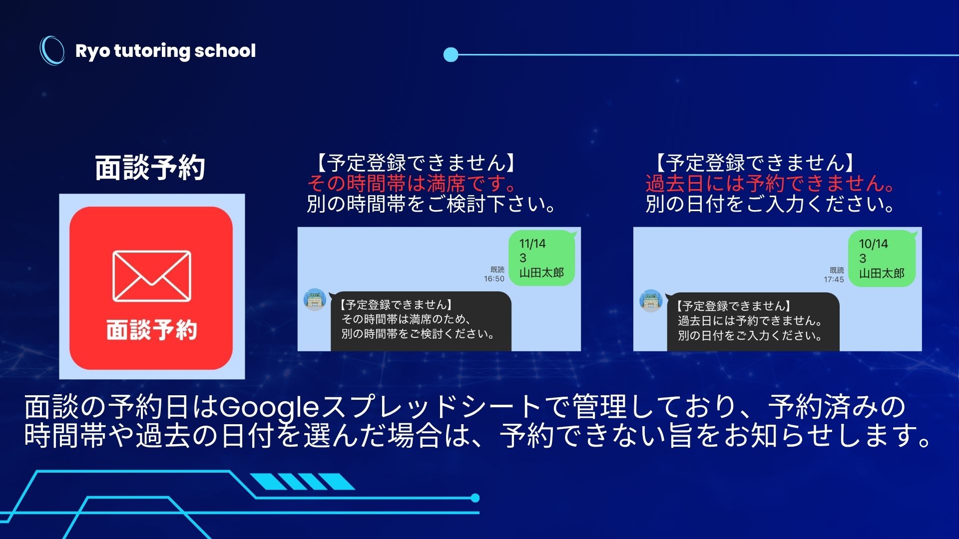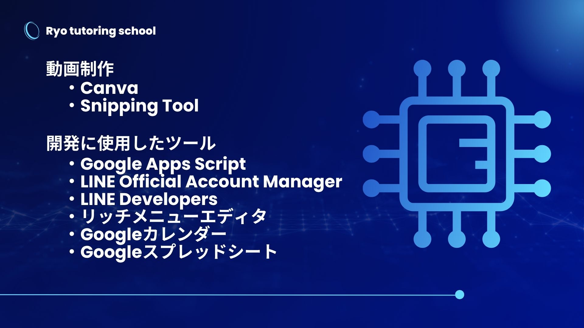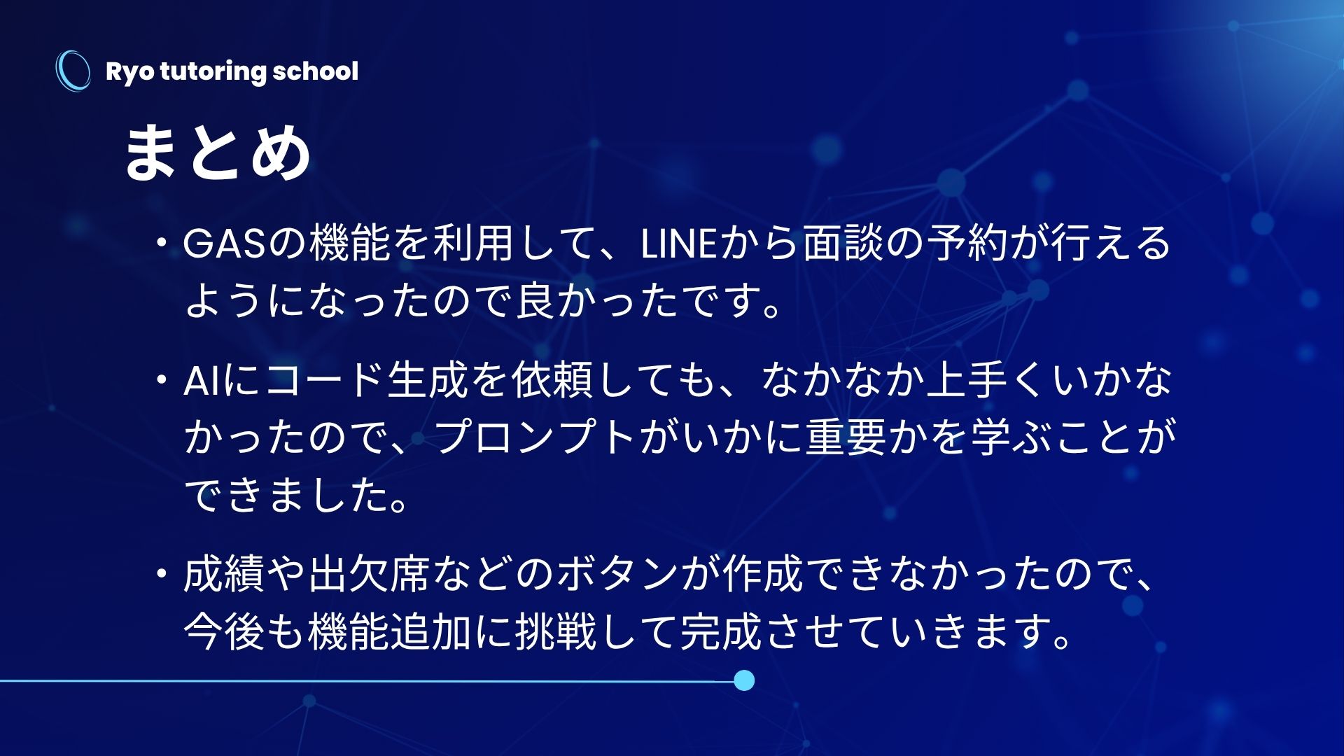 GASでLINEからの面談予約を実現し、AI活用ではプロンプト設計の重要性を学びました。成績・出欠席ボタンは未実装のため、今後も機能追加に挑戦して完成を目指していきます。
