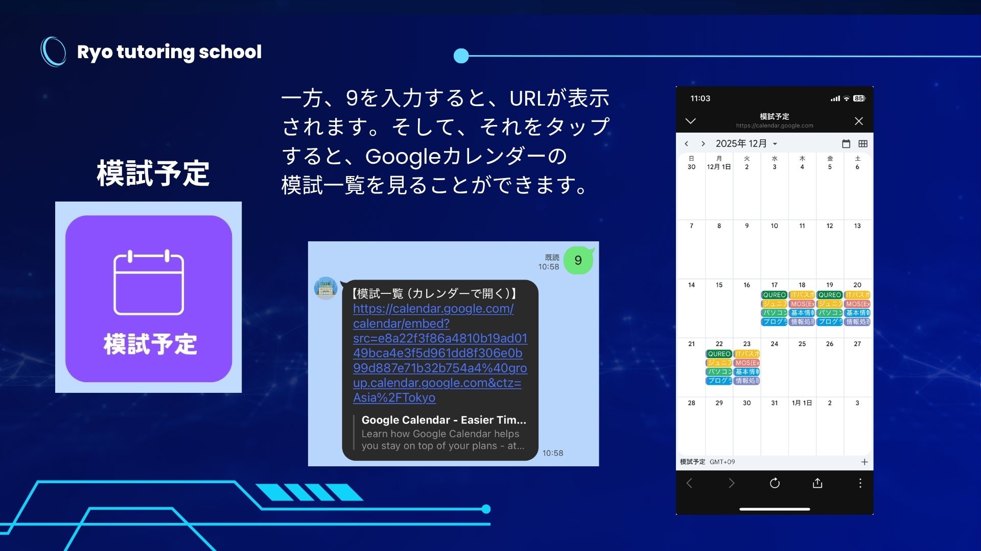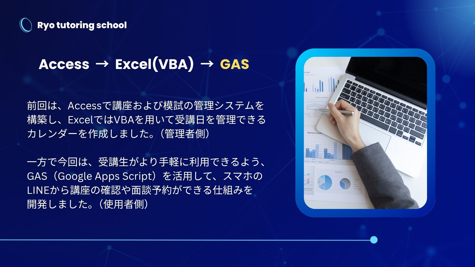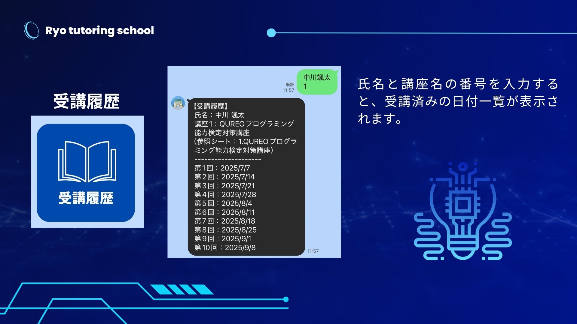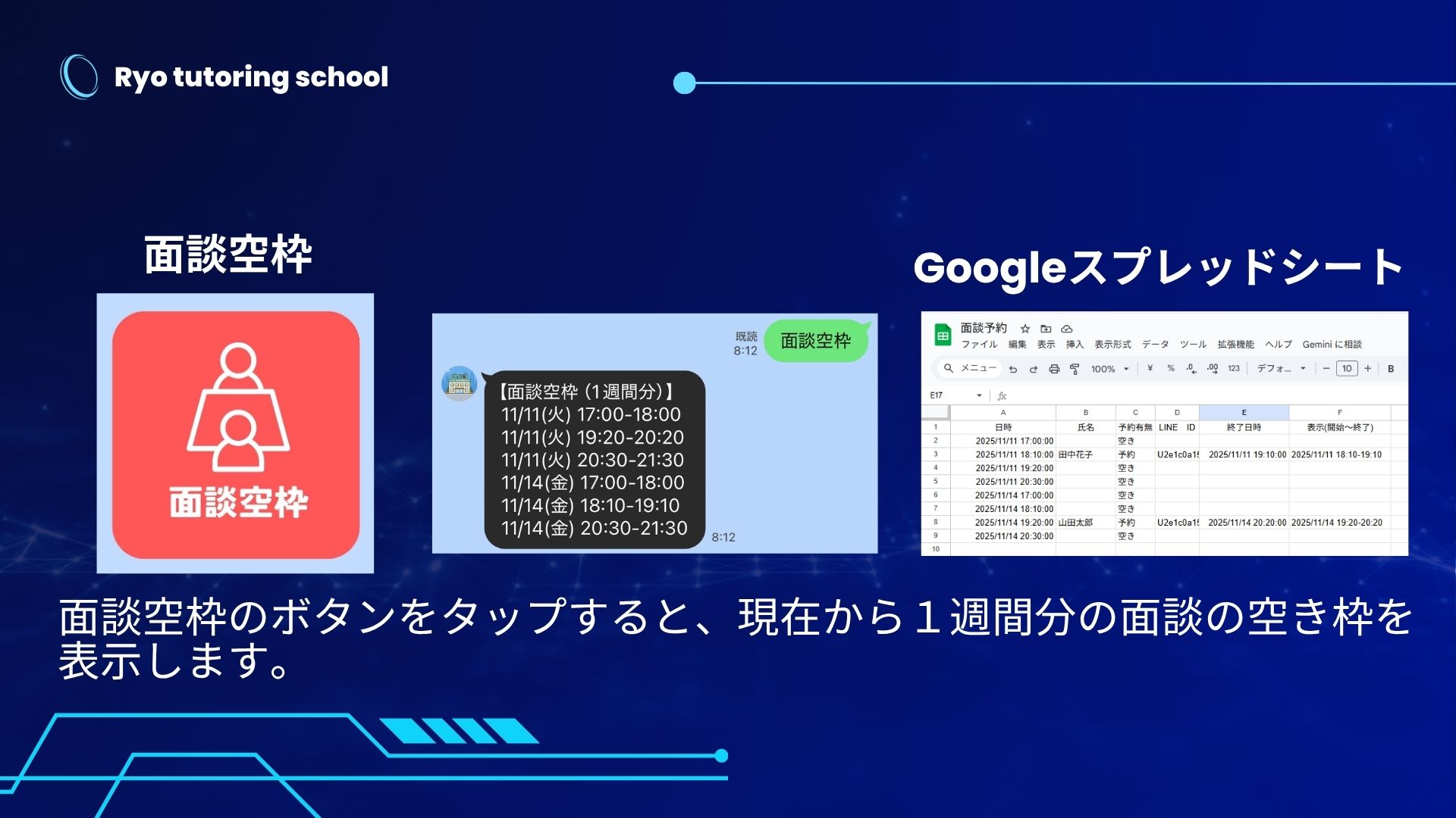 GASでLINEからの面談予約を実現し、AI活用ではプロンプト設計の重要性を学びました。成績・出欠席ボタンは未実装のため、今後も機能追加に挑戦して完成を目指していきます。