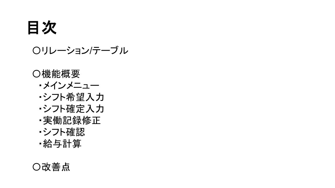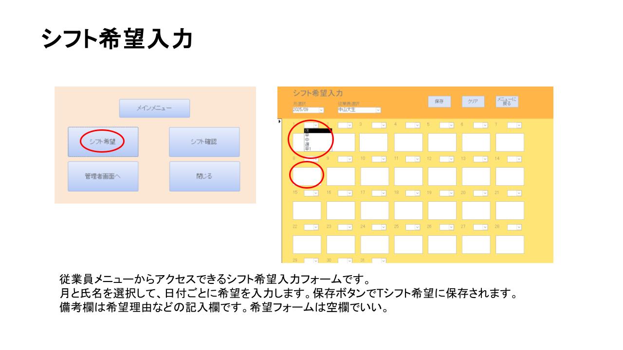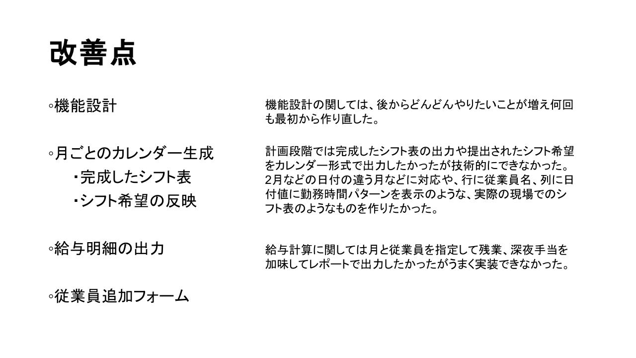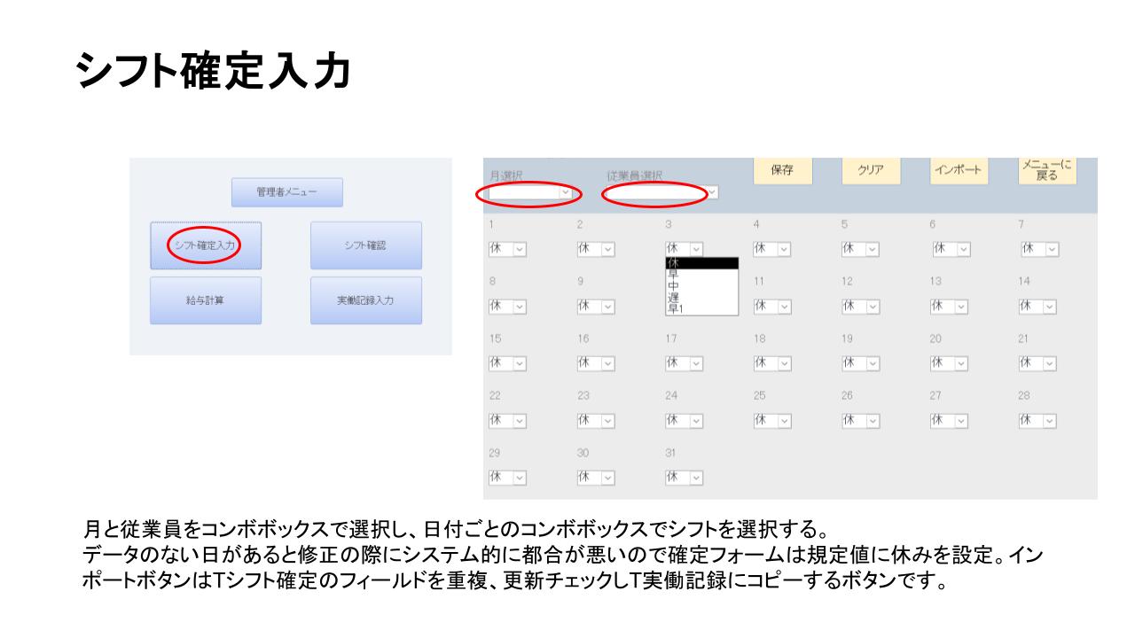 nシフト表の出力や、給与計算の実装など全くできていません。入力や表示に関してもまだまだ改善の余地があります。今後のVBAや総合の制作で、改善を目指していきたいと思います。