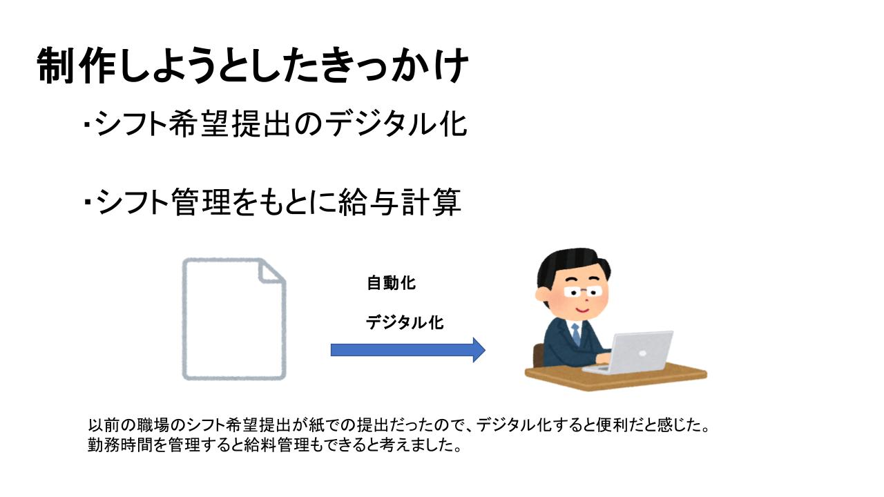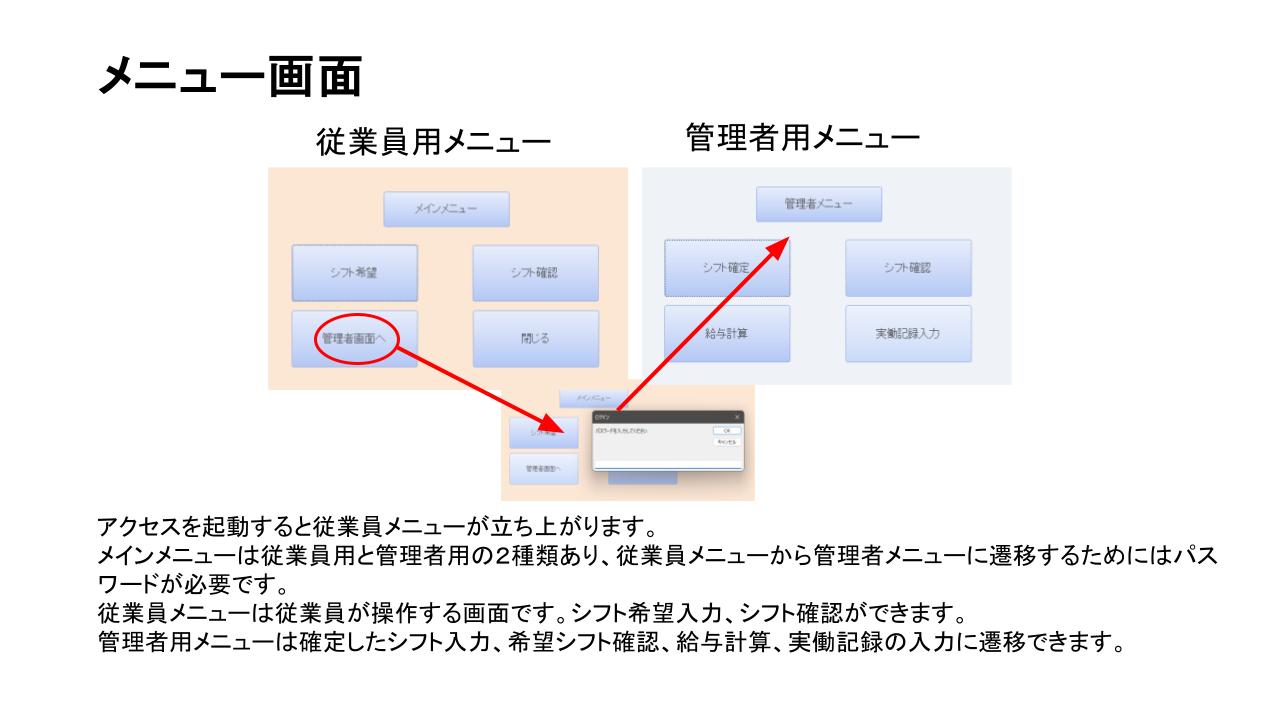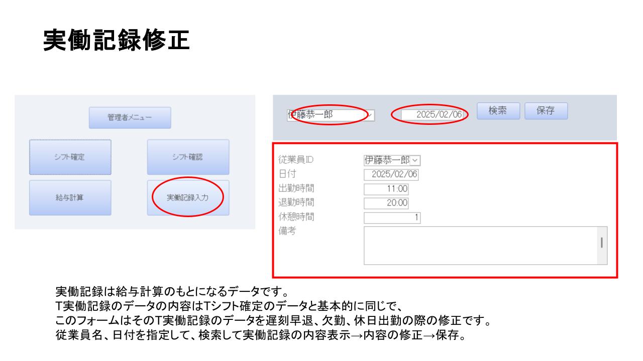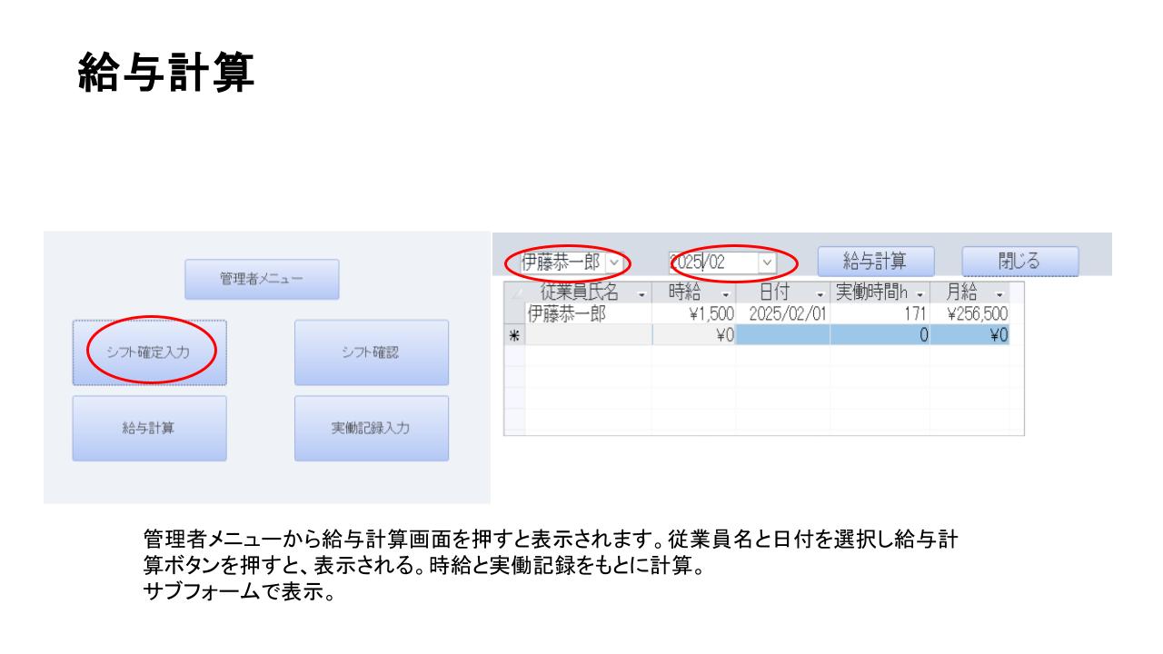 nシフト表の出力や、給与計算の実装など全くできていません。入力や表示に関してもまだまだ改善の余地があります。今後のVBAや総合の制作で、改善を目指していきたいと思います。