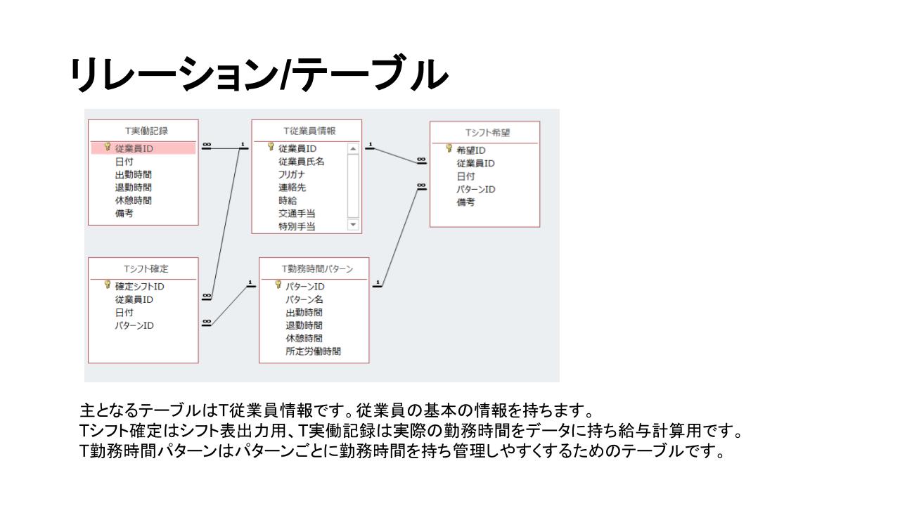 今回の制作は、とにかく初期設計が甘く、リレーション、テーブルの中身、データの型に苦戦し何度もいちから作り直しました。また、Access(DB)の知識も浅く、何ができるのか理解してない段階での設計でした。