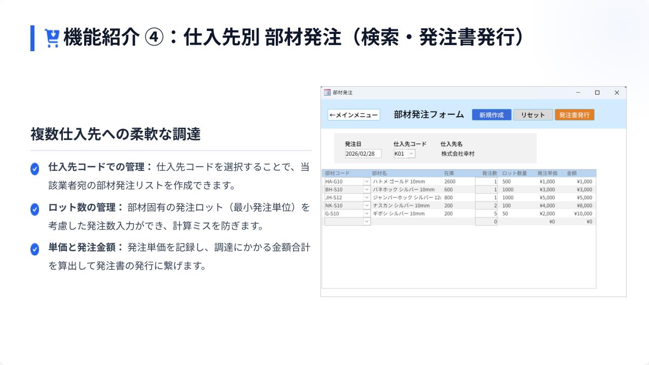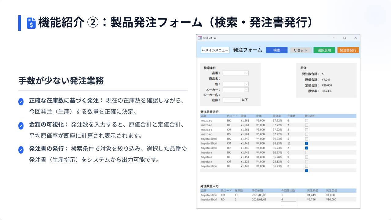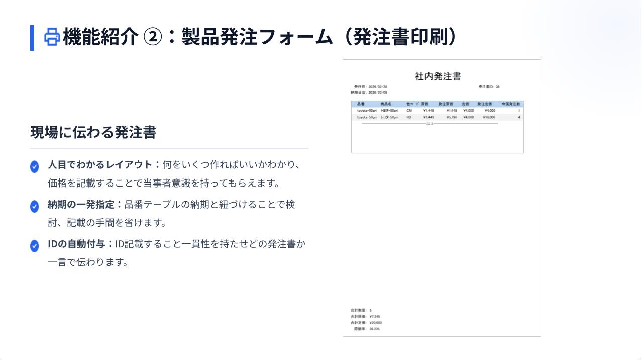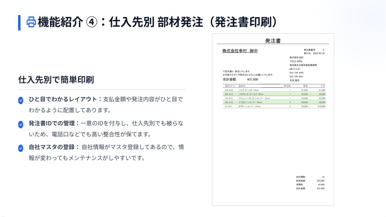 また、社内工房への製品発注書の発行と、部材の仕入先への発注書発行が可能です。