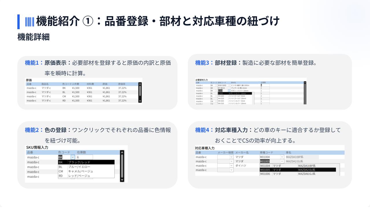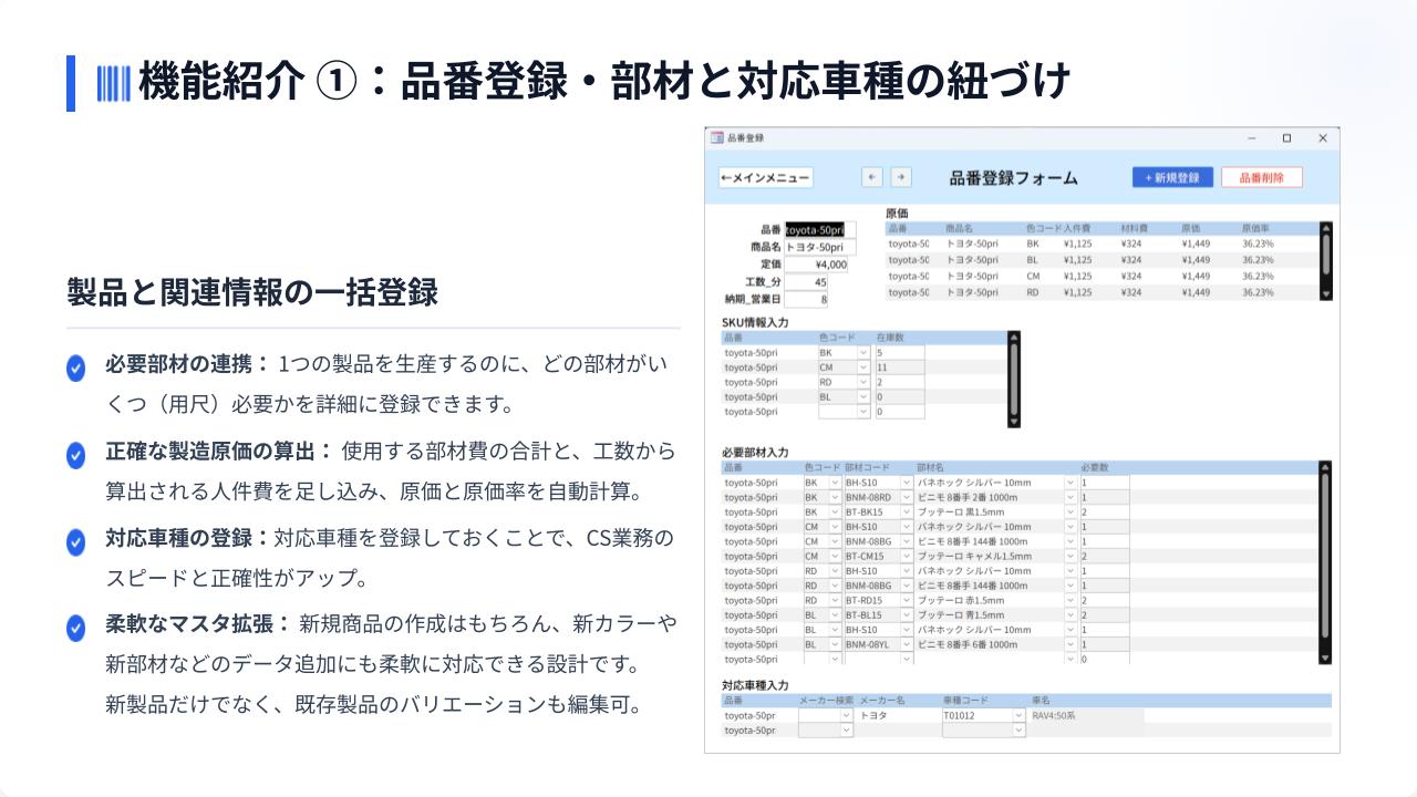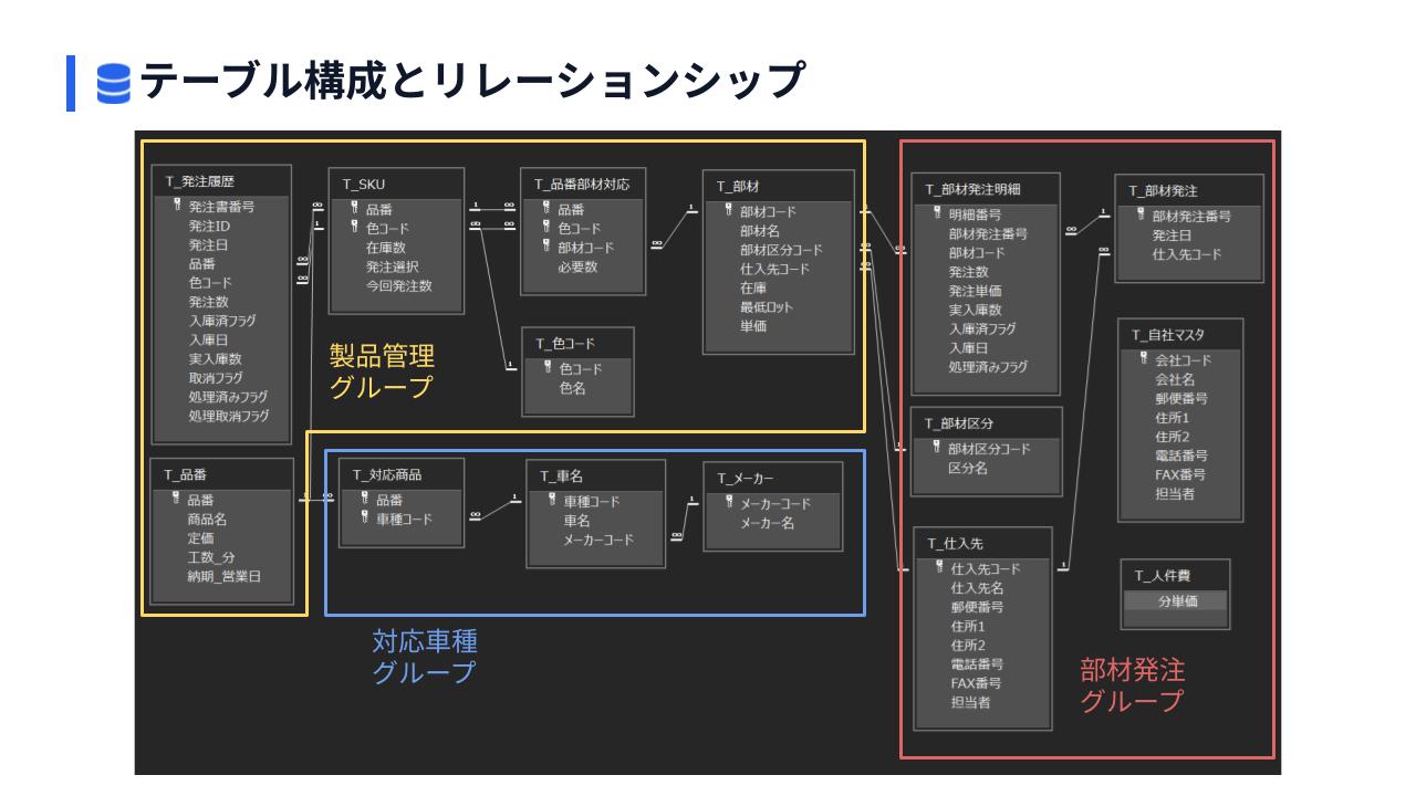 商品の新規登録→カラバリ登録→必要部材登録→対応車種→現場への発注→入庫→部材の発注→部材の入庫が一貫して行えるDBです。
