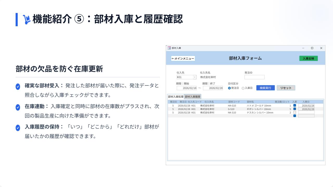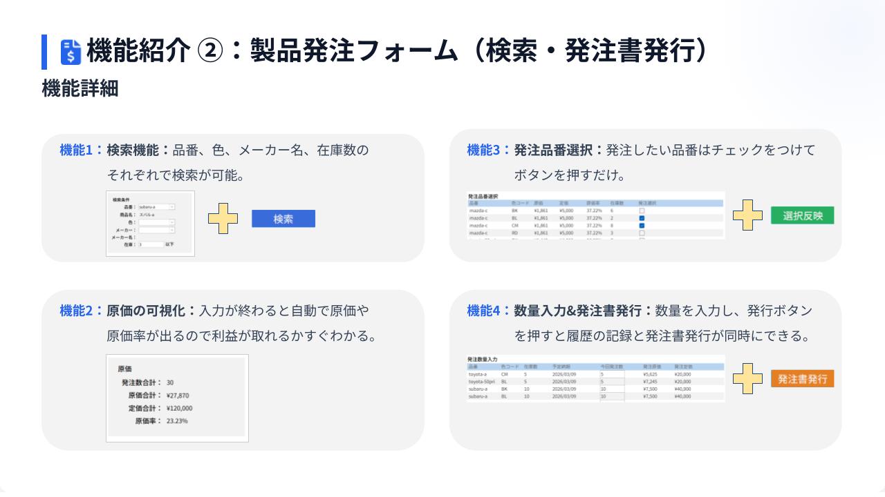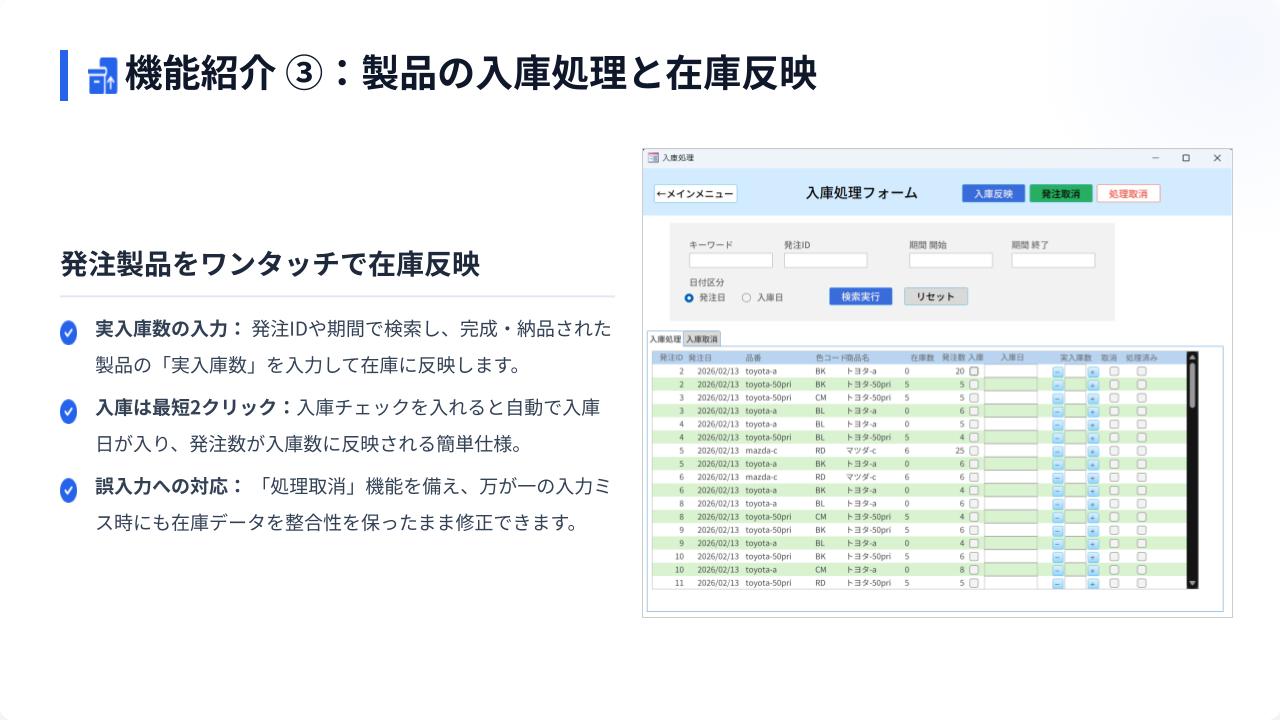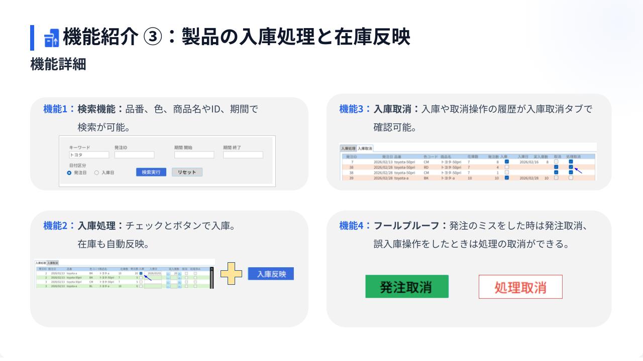 商品の新規登録→カラバリ登録→必要部材登録→対応車種→現場への発注→入庫→部材の発注→部材の入庫が一貫して行えるDBです。