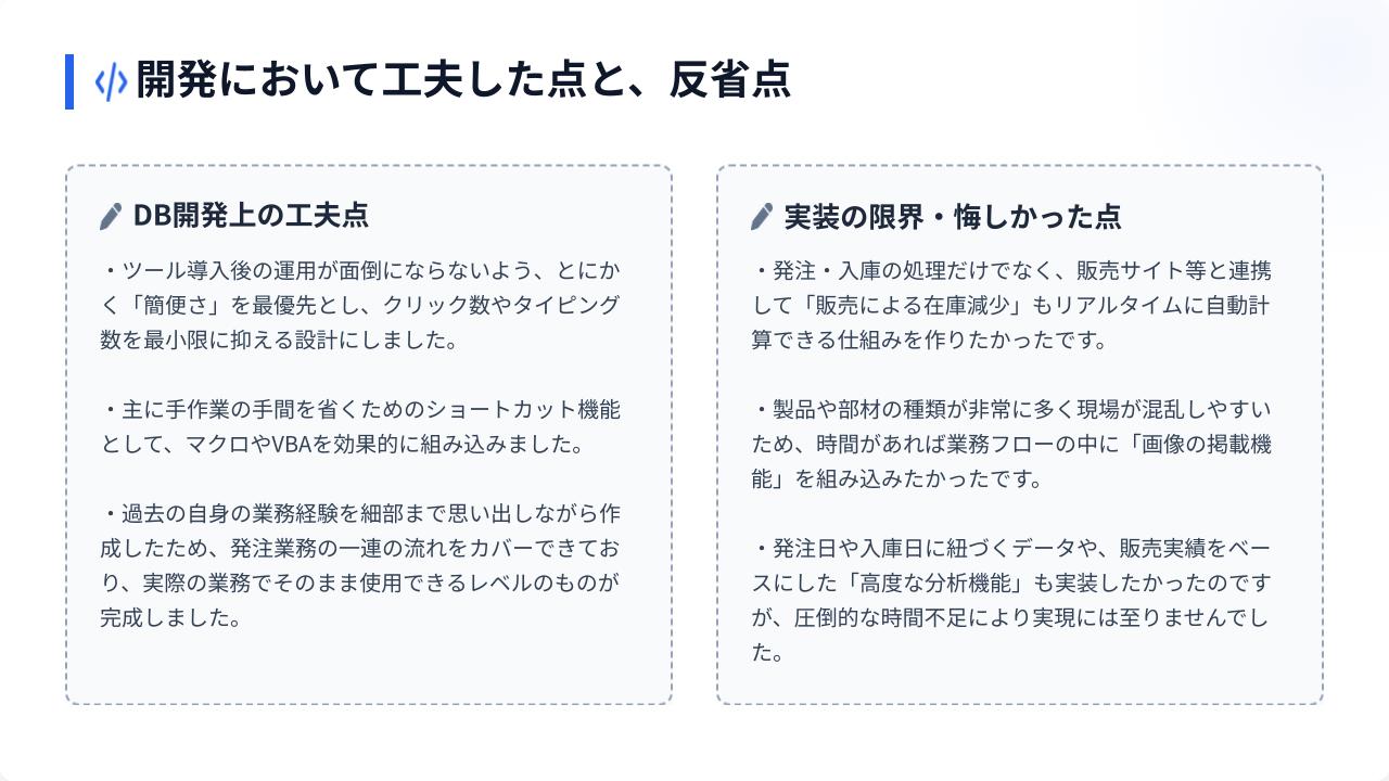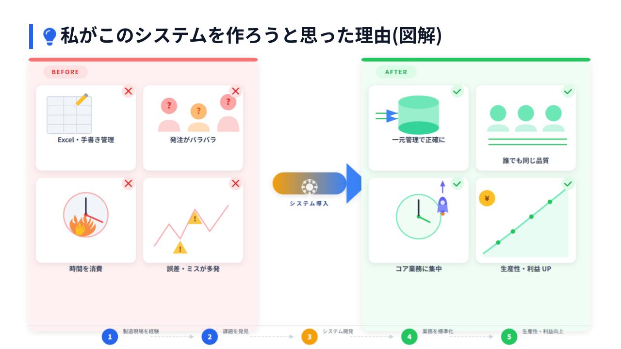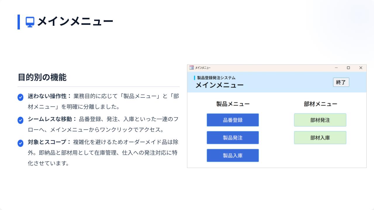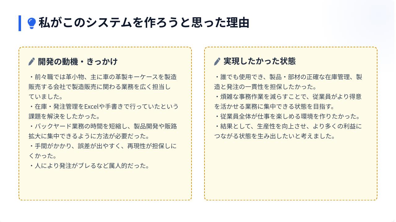 以前の仕事で手書きやエクセルで時間をかけて行っていた業務をDB化し、一貫性のある製品や部材の管理がしたく、その課題を解決するために作成しました。