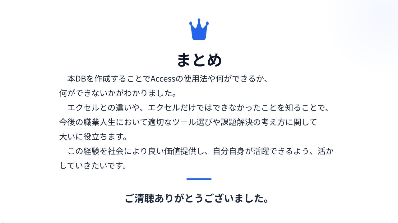 Accessというものを初めて触りました。なんとか形にはなりましたが、DB、プレゼンともに多くの課題が残る結果となりました。