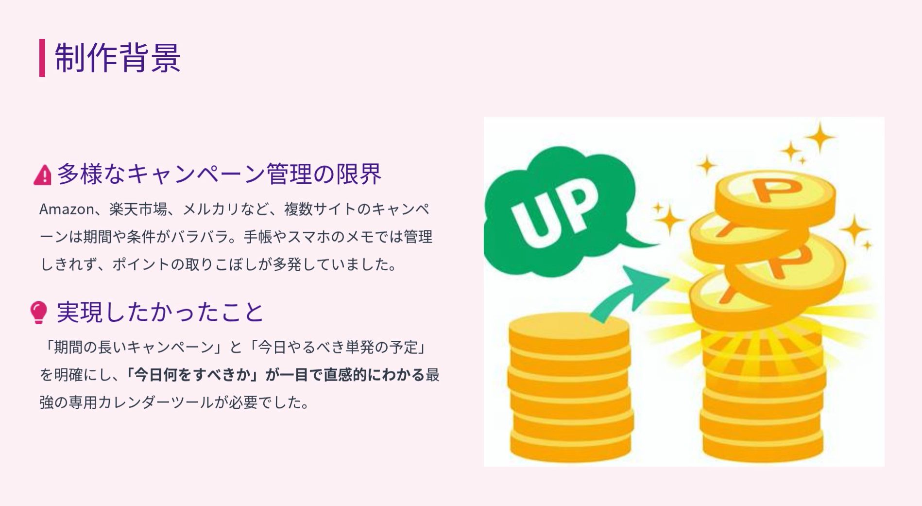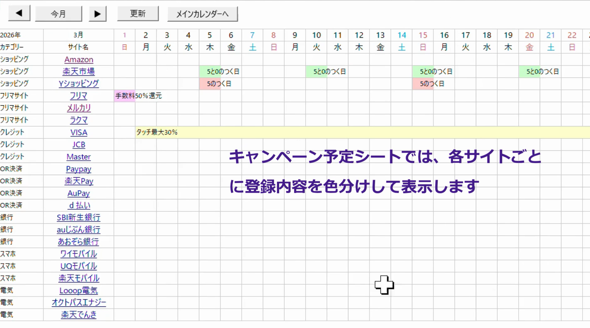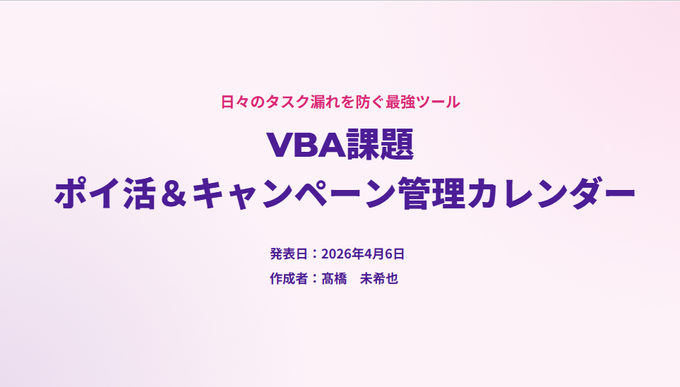 様々なポイントキャンペーンがあり手帳やスマホで管理することに感じていました。VBAを使い、一括で管理することを目指したいと思いました。