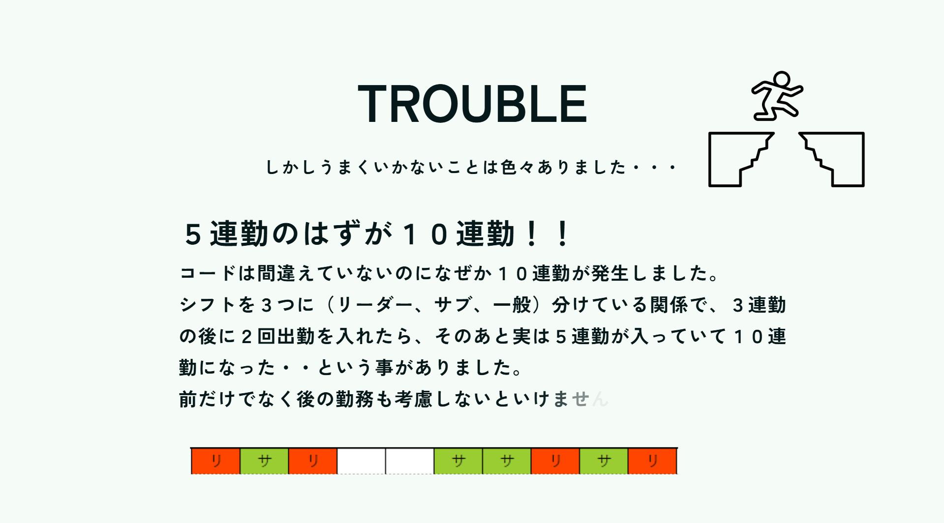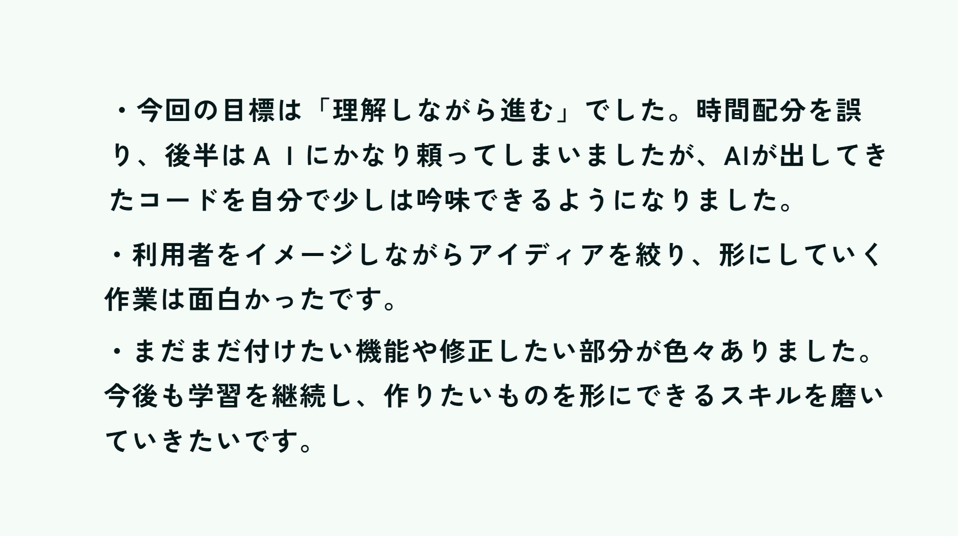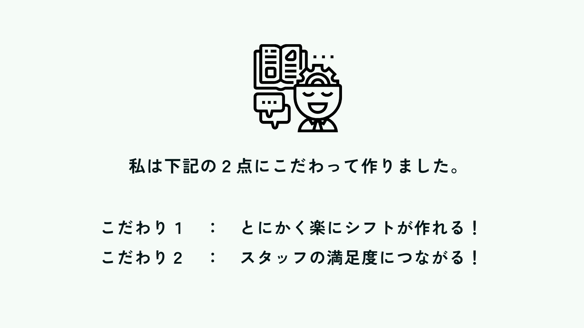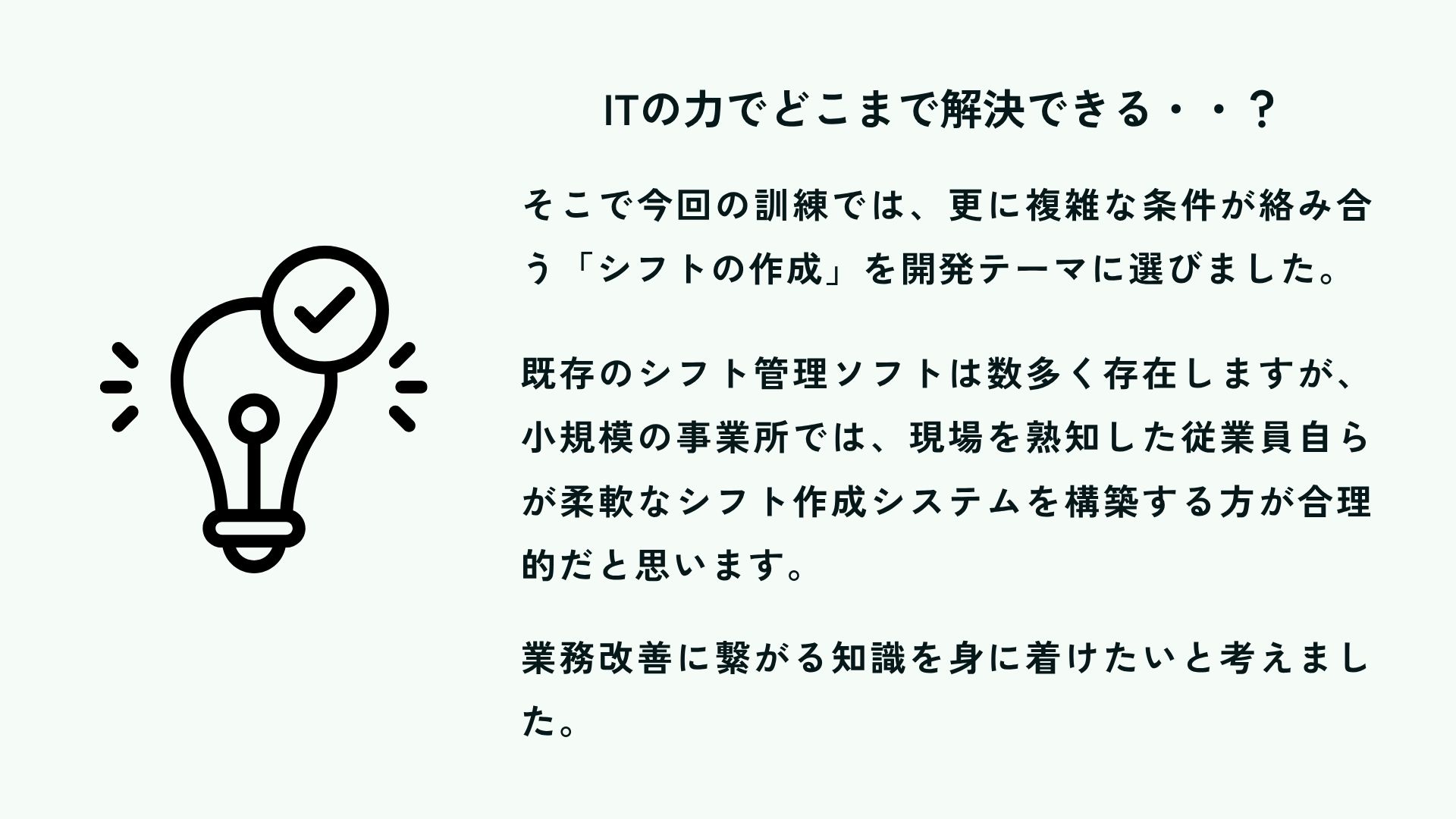 シフトを組むロジックを考えるのに苦労しました。発表では、スタッフの登録画面やシフト表の色についてなど、色々ご意見いただきました。今後の参考にしていきたいと思います。