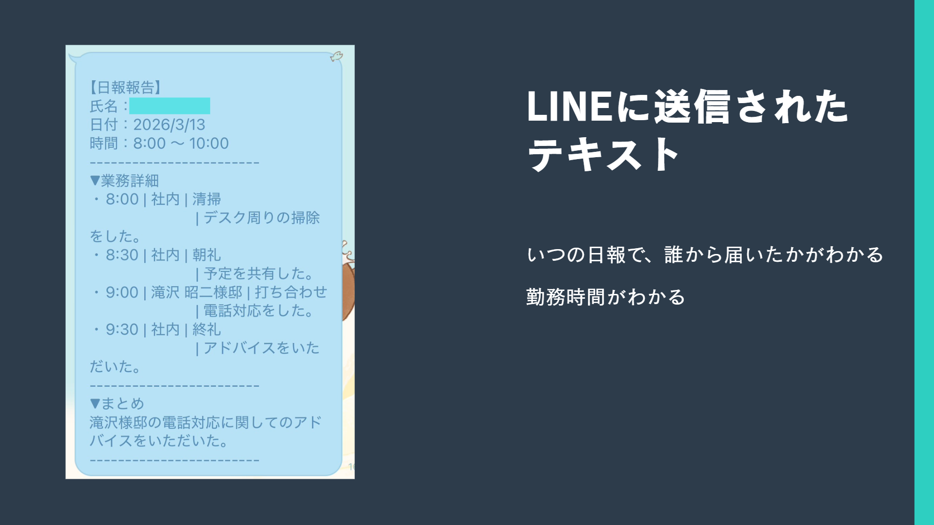 ・作成した日報を上司のLINEに送信できる。