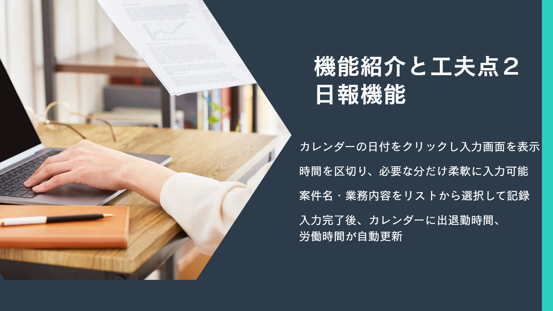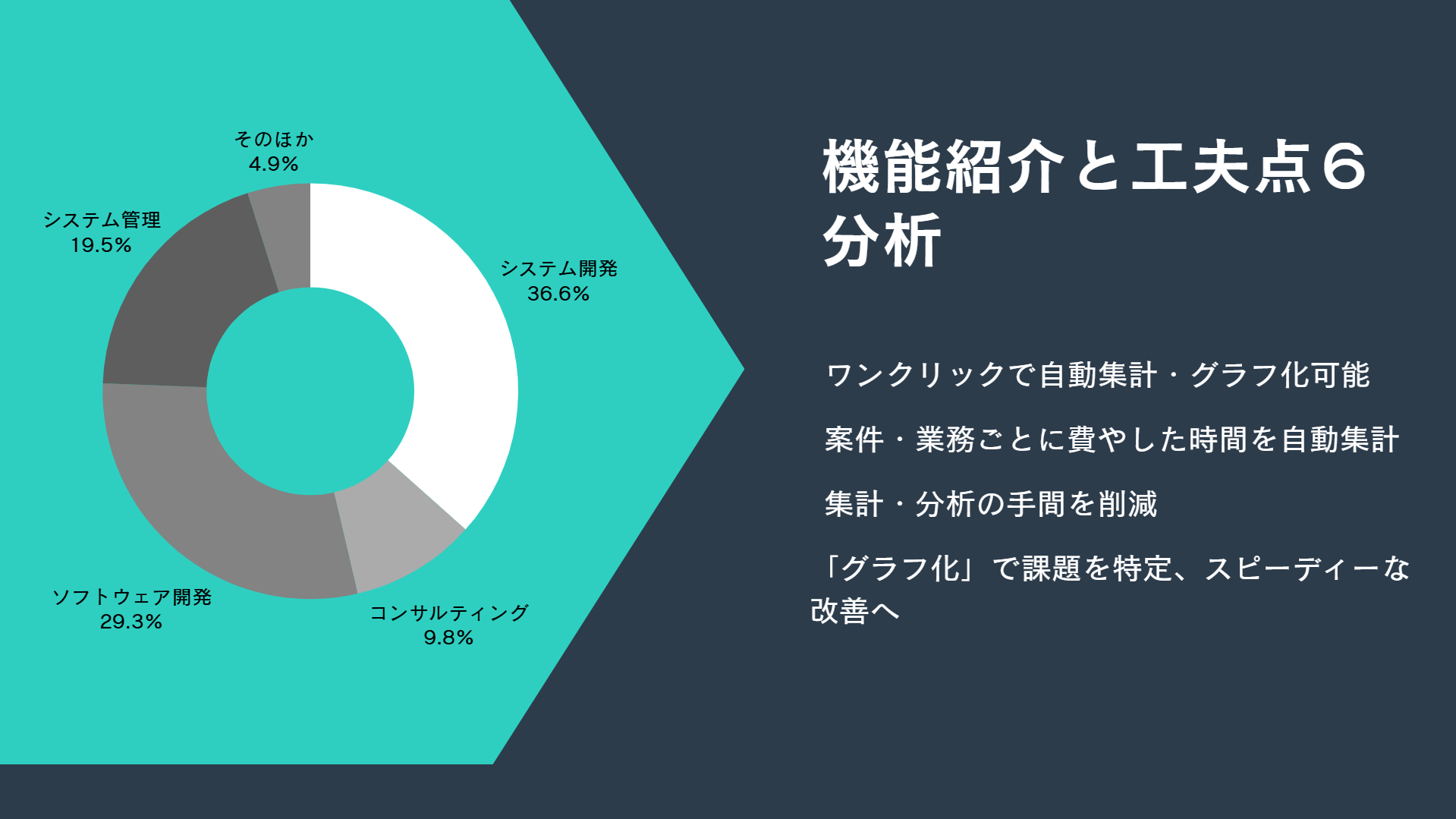 ・入力した日報を元に、何に何時間かかっているのか、業務を分析できる。