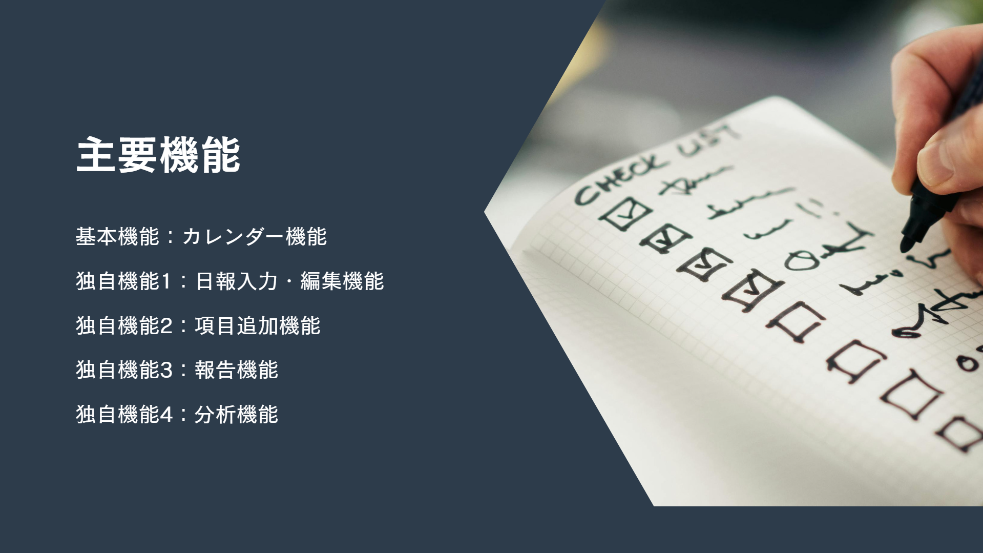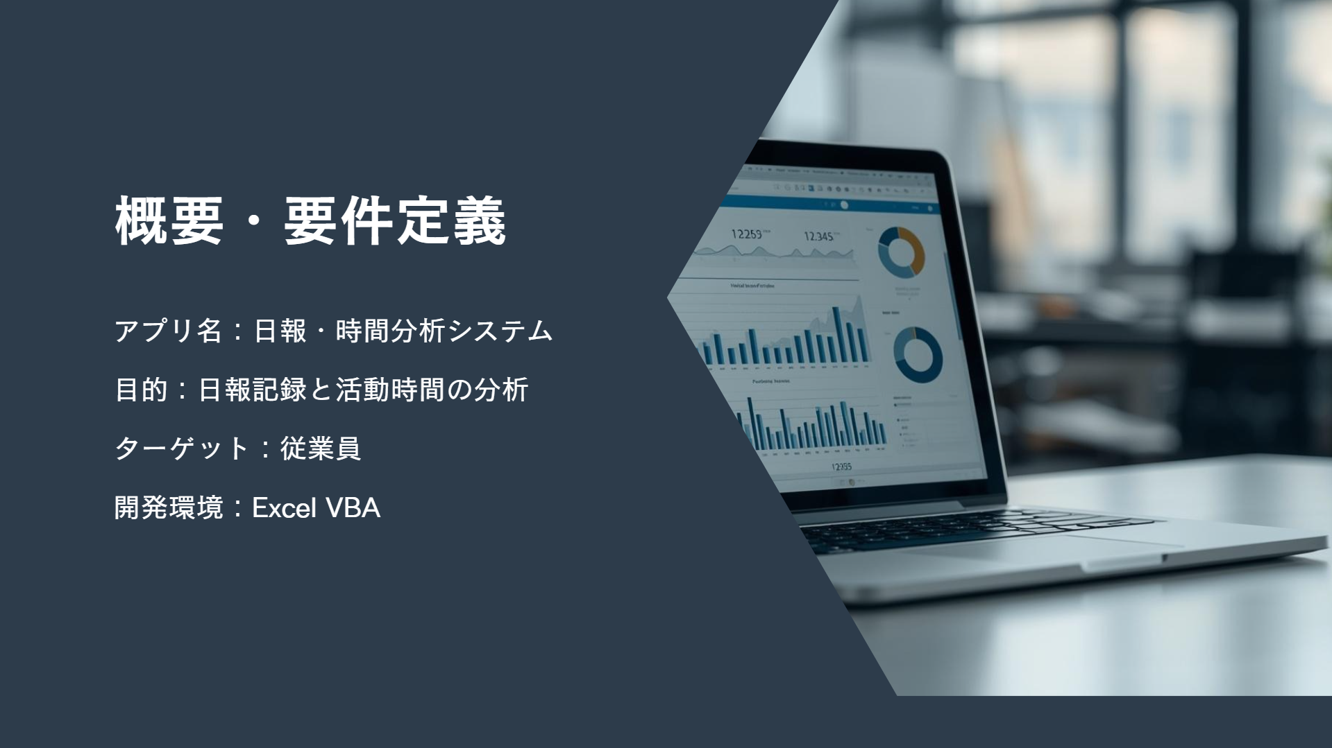 日報の入力時や、業務時間の分析に多大な手間と時間がかかっているという現状をふまえ、日報の記録と記録をもとに分析を行うシステムを作成しました。