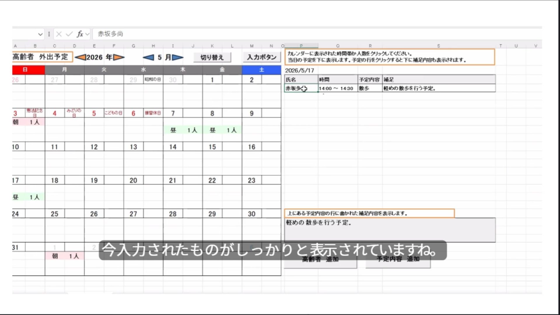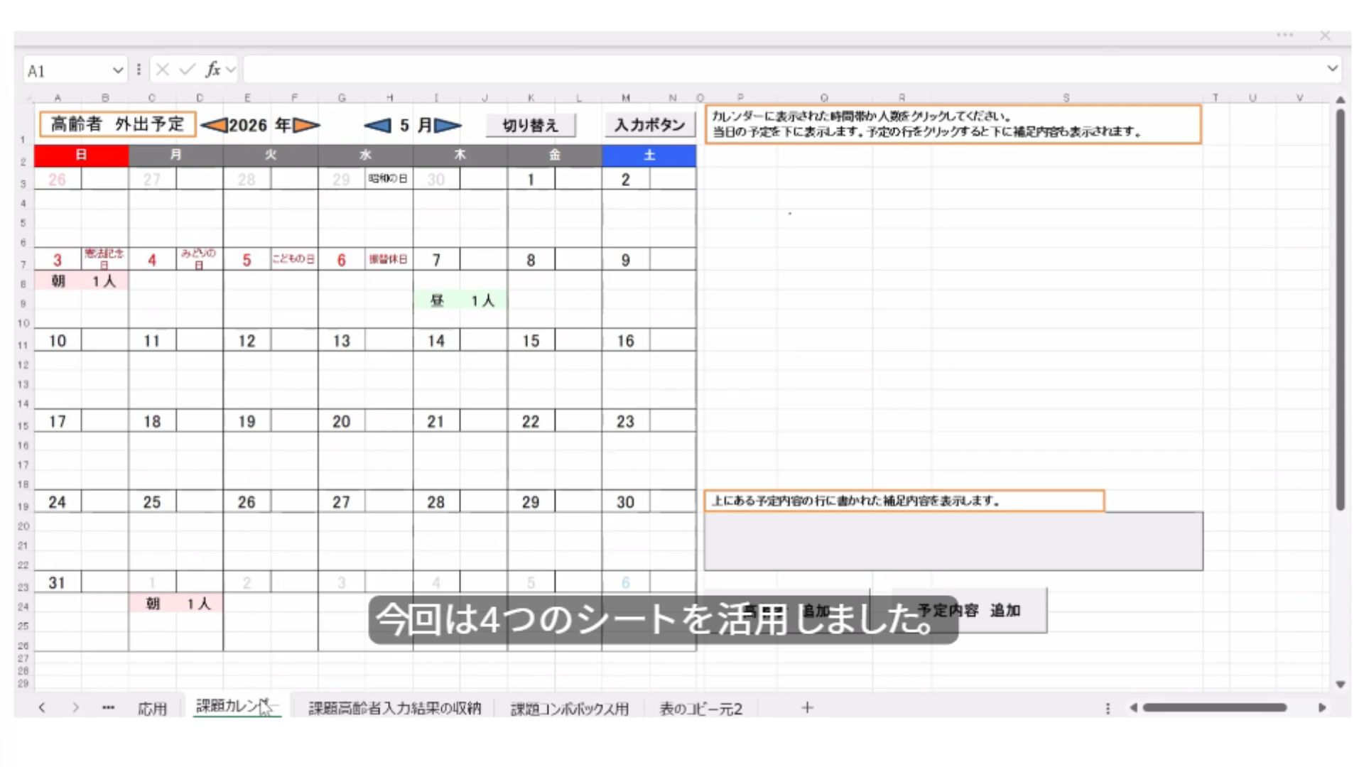 ・予定内容を入力したら、それに応じてカレンダーの予定人数が把握できます。また、予定のある日をクリックするとその人の予定の内容や補足も見直せます。(補足は別の結合セルに入れている)