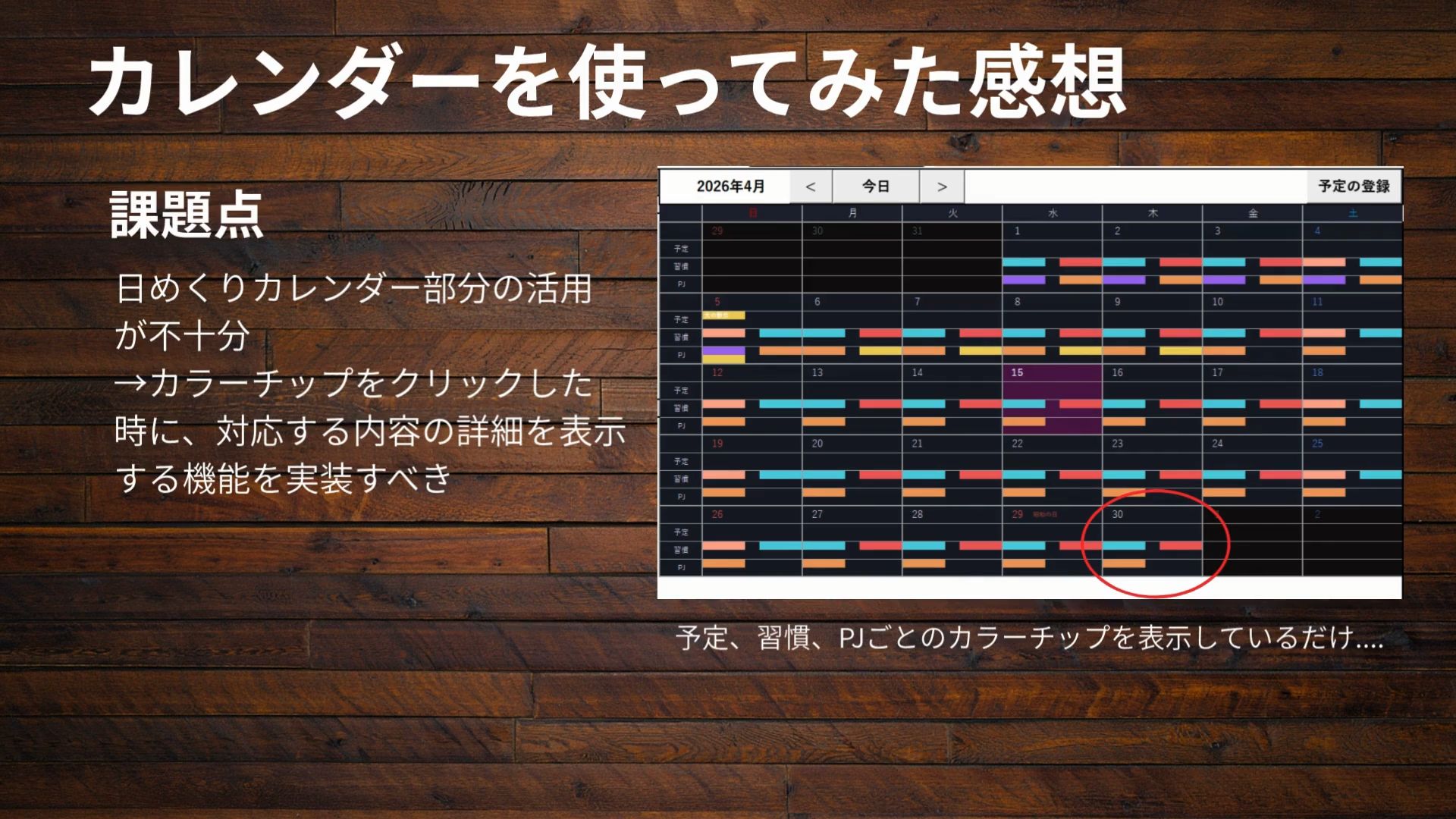 ・該当する予定、習慣、プロジェクトを、カラーチップとしてカレンダーに表示する