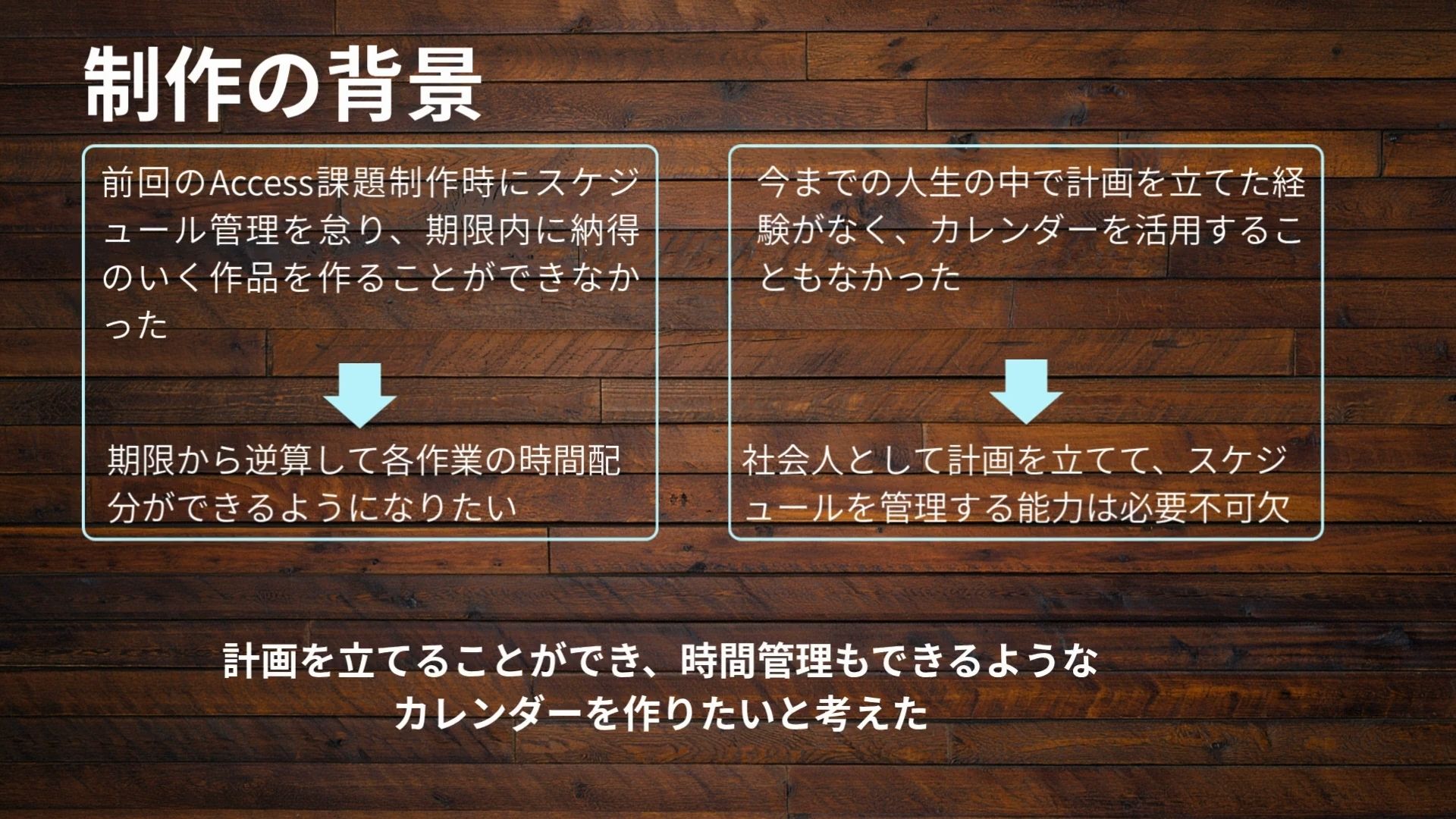 前回のデータベース制作時に計画管理を怠った結果、納得の行く作品を期限内に作り上げることができませんでした。そこで、カレンダーアプリ内で計画を立てることができ、かつ、それぞれの作業時間を管理できるような作品を作ろうと思い至りました。