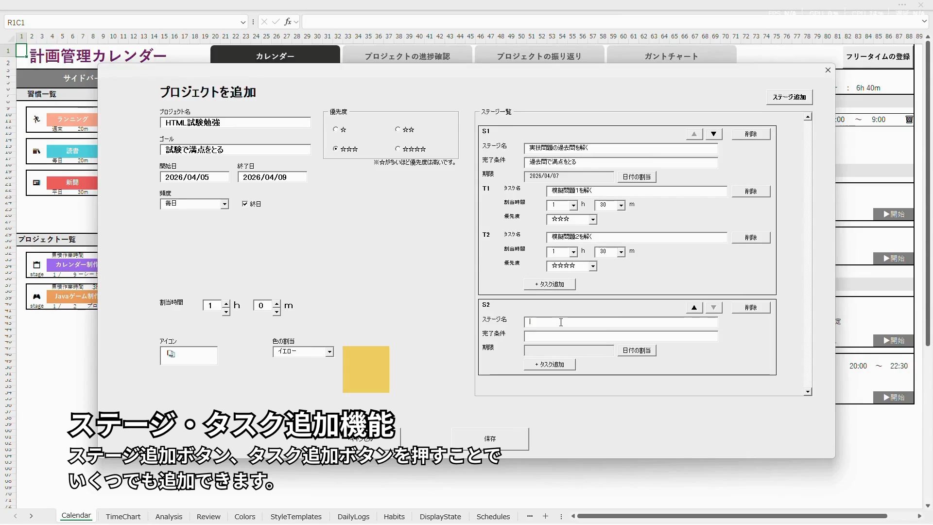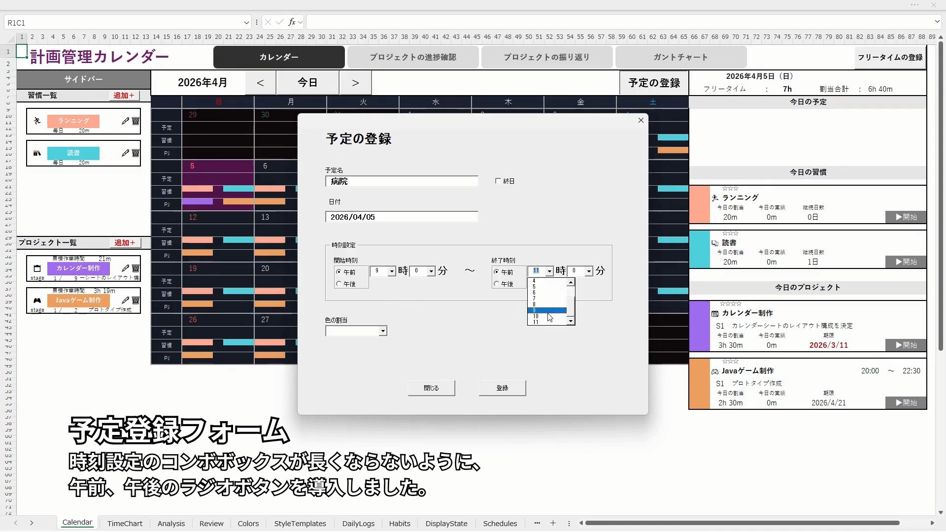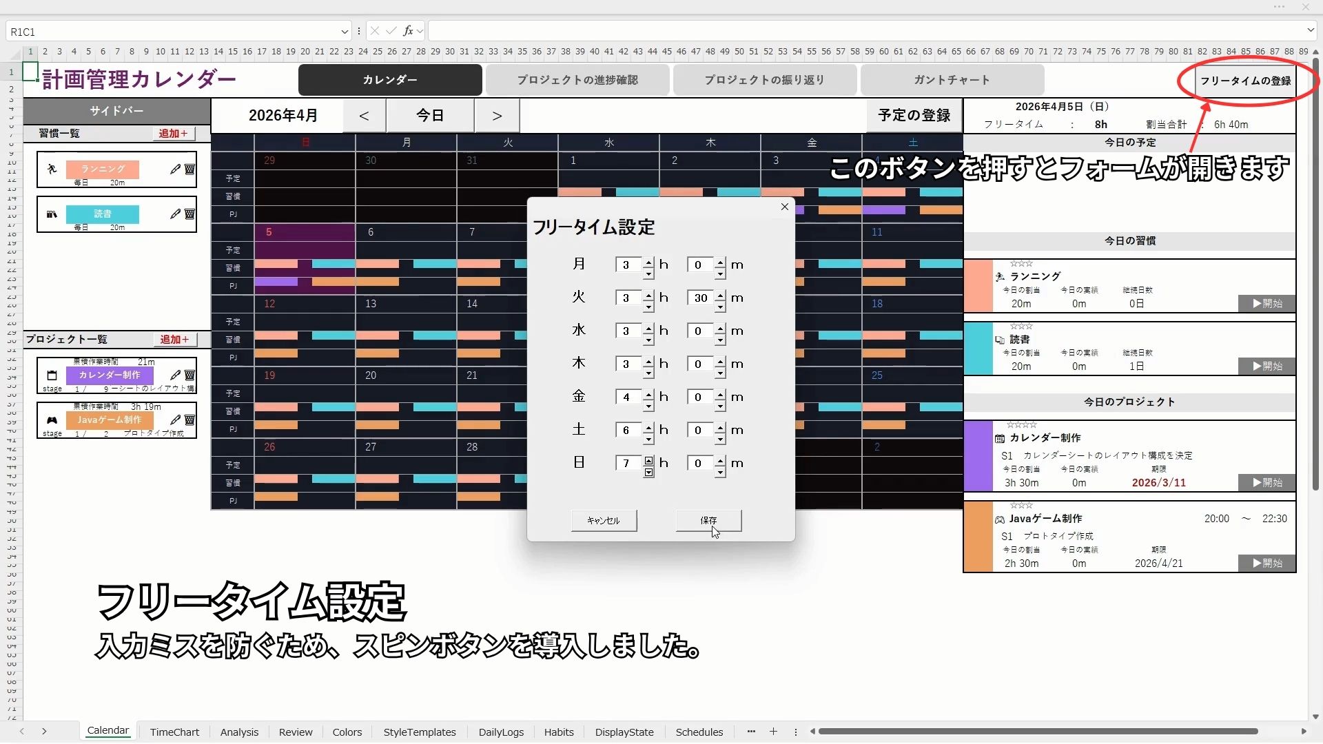 ・フリータイム、予定、習慣、プロジェクトの登録